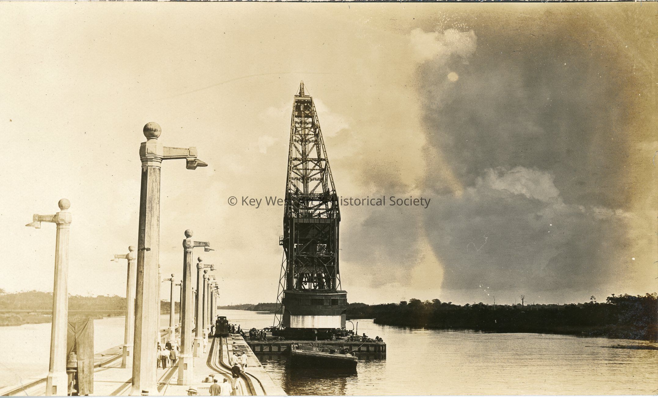 Black and white photograph depicting the construction of the Panama Canal. The photograph shows a crane on the water by a concrete pier. This photo was likely taken at the Gatun Locks. The photograph was designed to be attached to a postcard backing.
