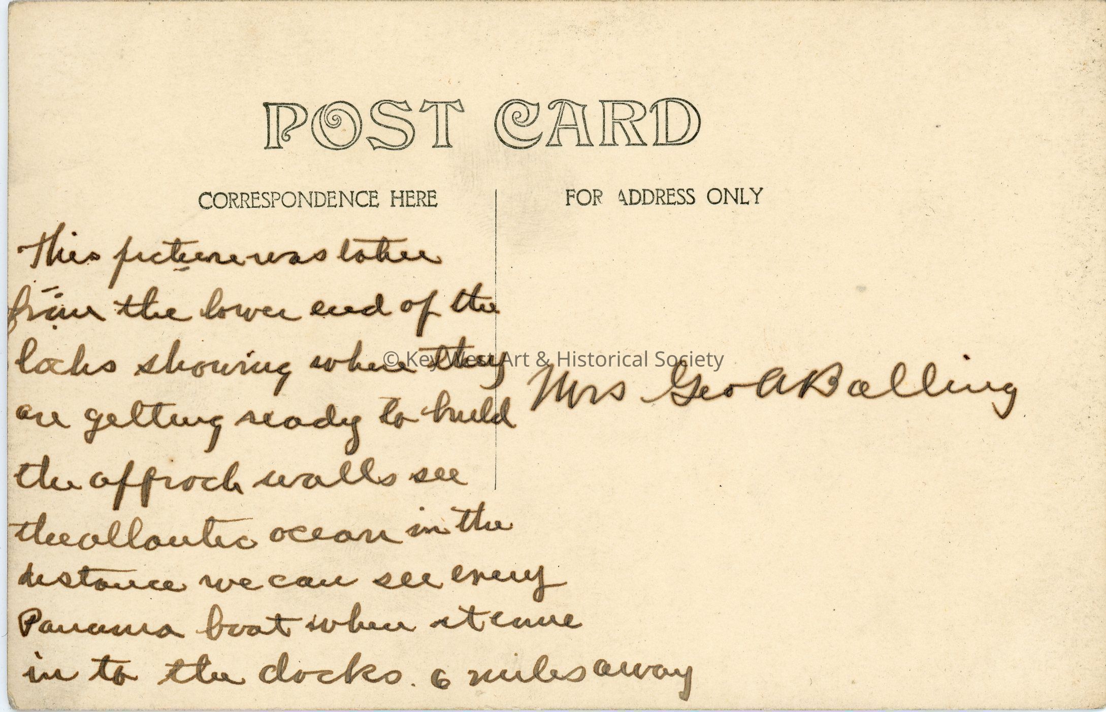 Black and white photograph postcard depicting the construction of the Panama Canal. The photograph shows the lower end of the locks, ostensibly at Gatun Lake. The postcard is addressed to Mrs. Geo. A. Balling and includes a handwritten note.Subject