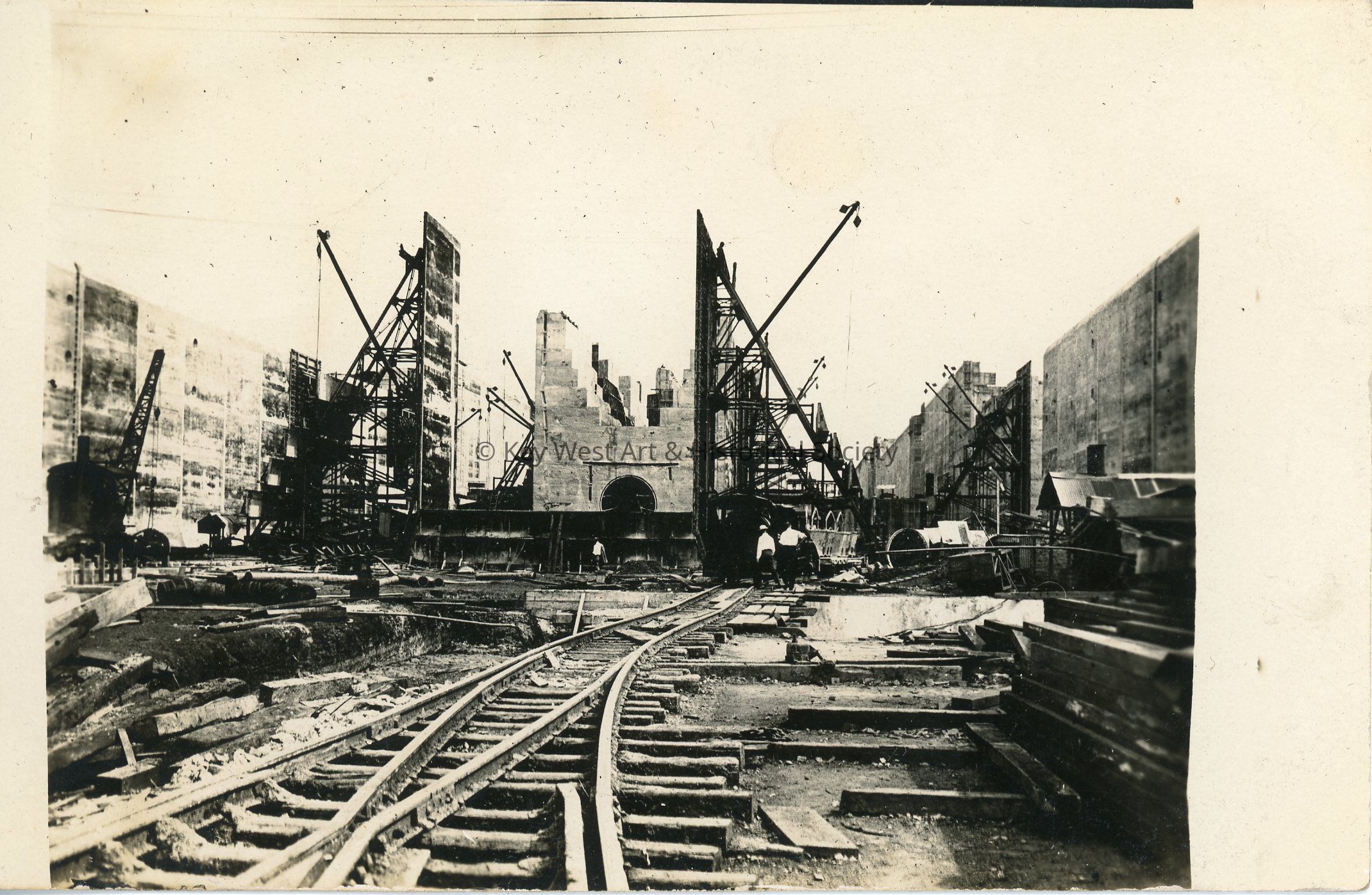 Black and white photograph postcard depicting the construction of the Panama Canal. The photograph shows the construction of a lock. The postcard is addressed to Mrs. G.A. Balling.Subject