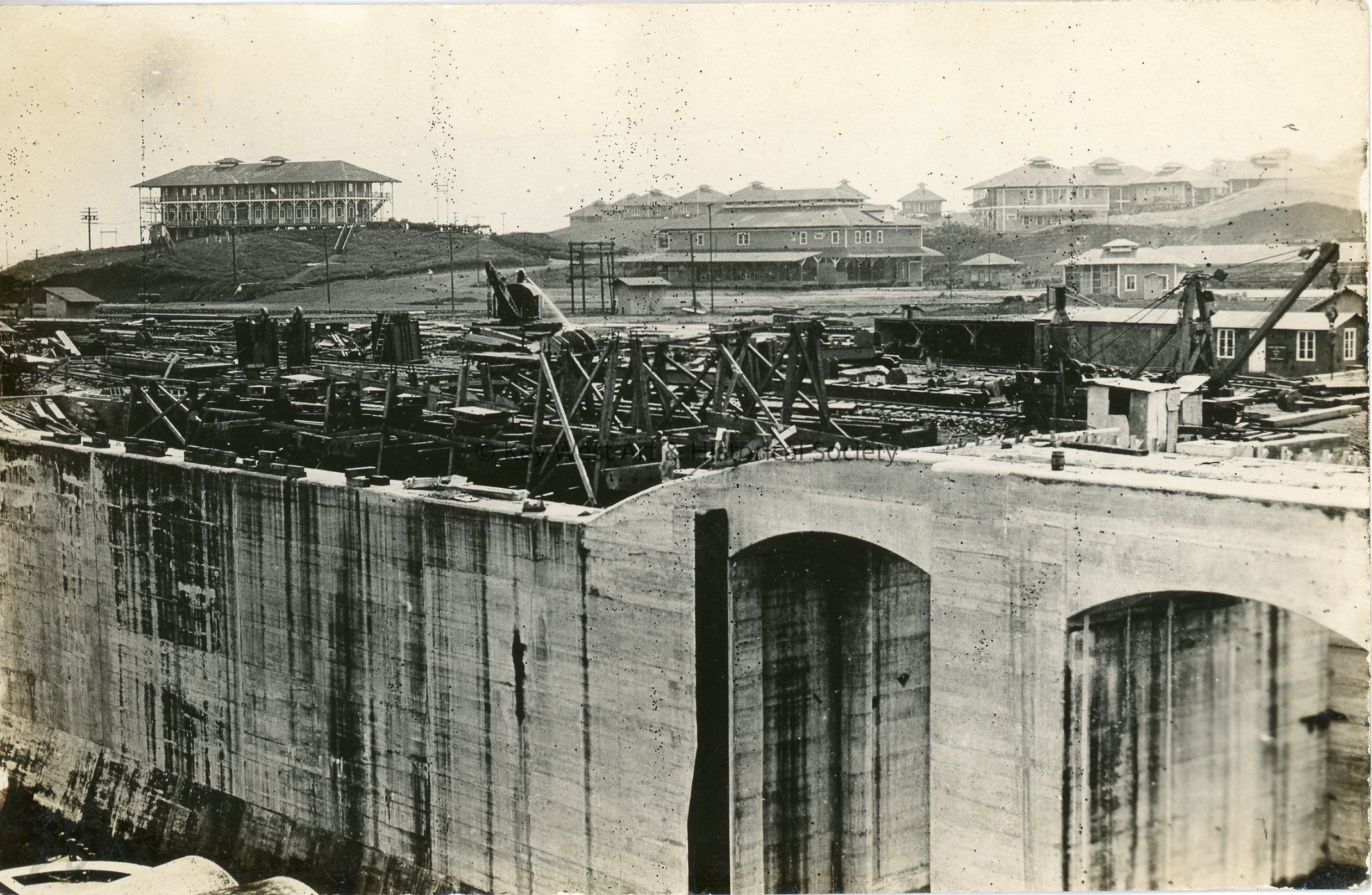 Black and white photograph postcard depicting the construction of the Panama Canal. The photograph is looking at a large concrete wall with buildings, likely housing, in the background and heavy equipment in between.Subject