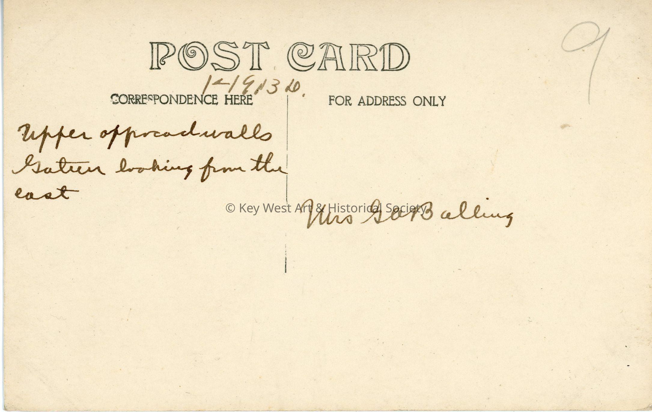 Black and white photograph postcard depicting the construction of the Panama Canal. The photograph shows the Gatun Locks upper approach walls as seen from the east. The postcard is dated January 1913 and is addressed to Mrs. G.A. Balling. Verso has a handwritten note.Subject