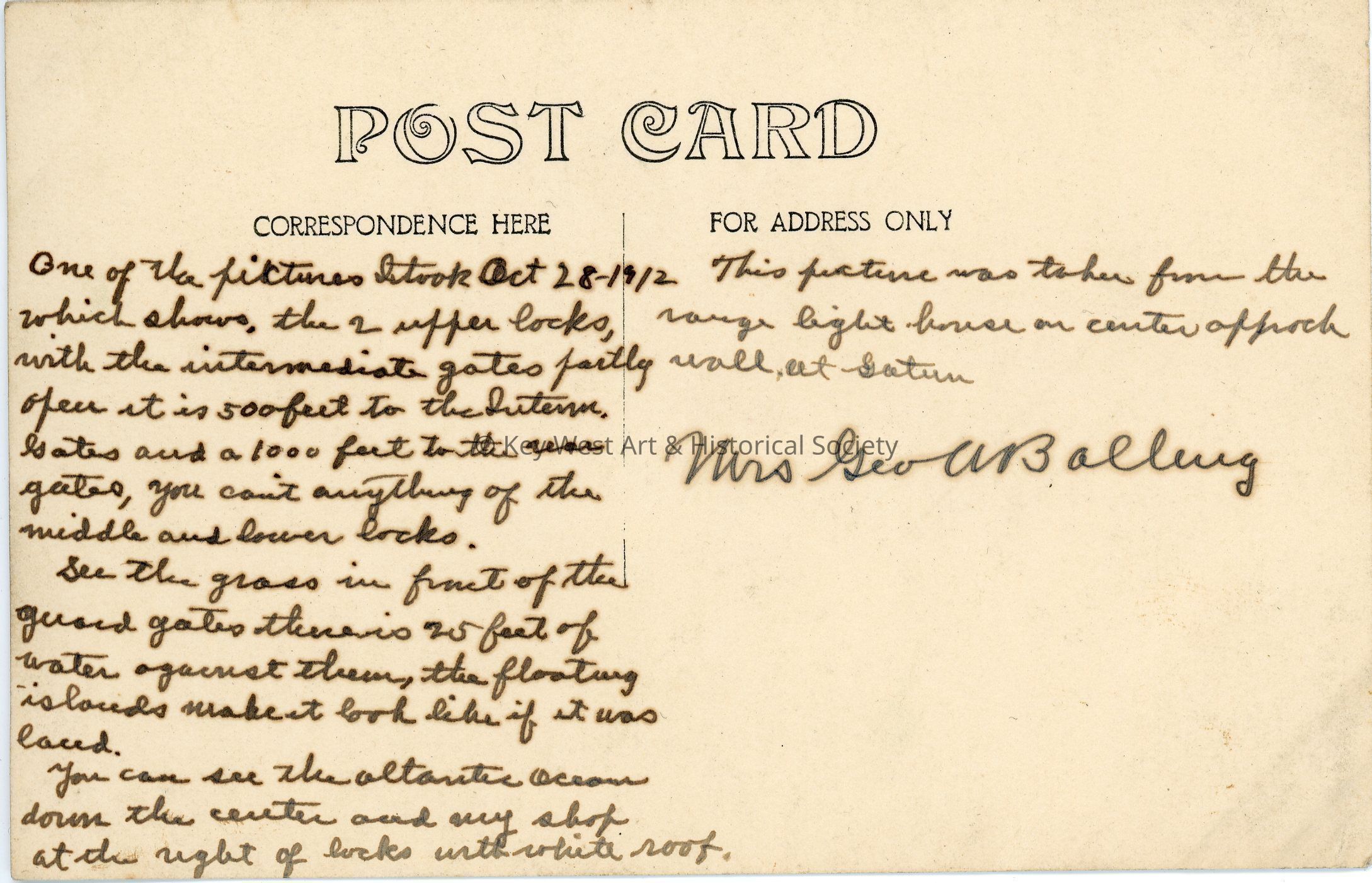 Black and white photograph postcard depicting the construction of the Panama Canal. The photograph is looking at the two (2) upper locks of the Gatun Locks. The Atlantic Ocean is in the center background. The postcard is addressed to Mrs. Geo. A. Balling. Verso has a handwritten note.Subject