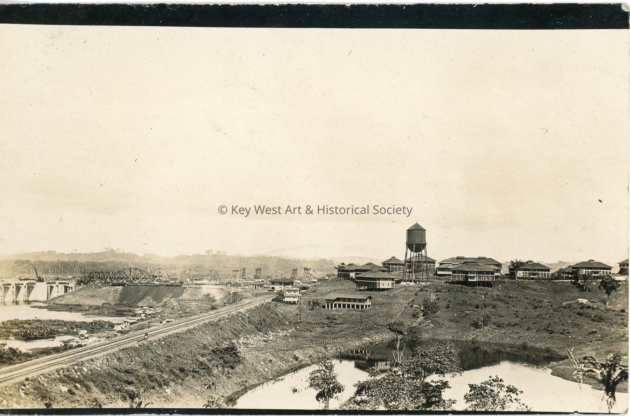 Black and white photograph postcard depicting the construction of the Panama Canal. The photograph is looking north towards the living quarters, YMCA, and water tank used by those working on the Panama Canal at the Gatun Locks. The postcard is addressed to Mrs. Geo. A. Balling. Verso has a handwritten note.Subject