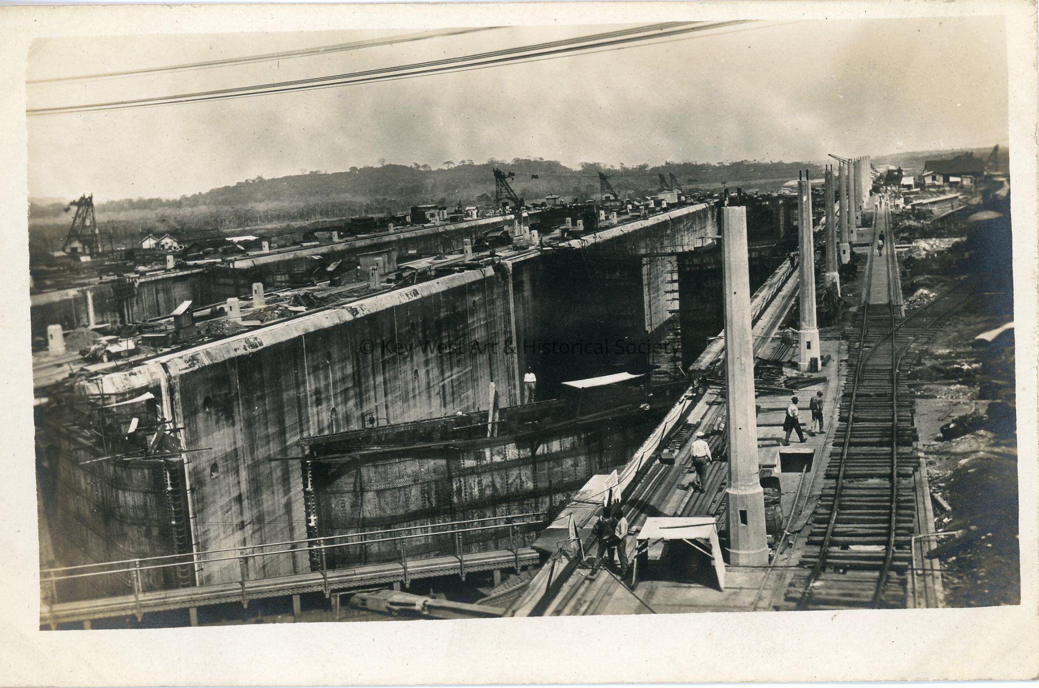 Upper lock looking north at Gatun. Concrete light just in course of erection.Language