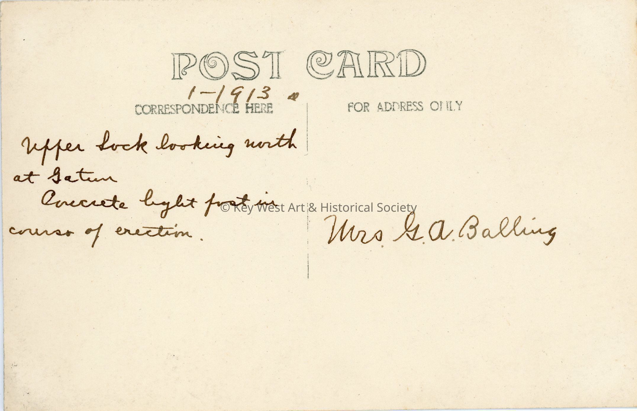 Black and white photograph postcard depicting the construction of the Panama Canal. The photo is looking north at the upper lock at Gatun Locks. The postcard is dated January 1913 and is addressed to Mrs. G.A. Balling.Subject