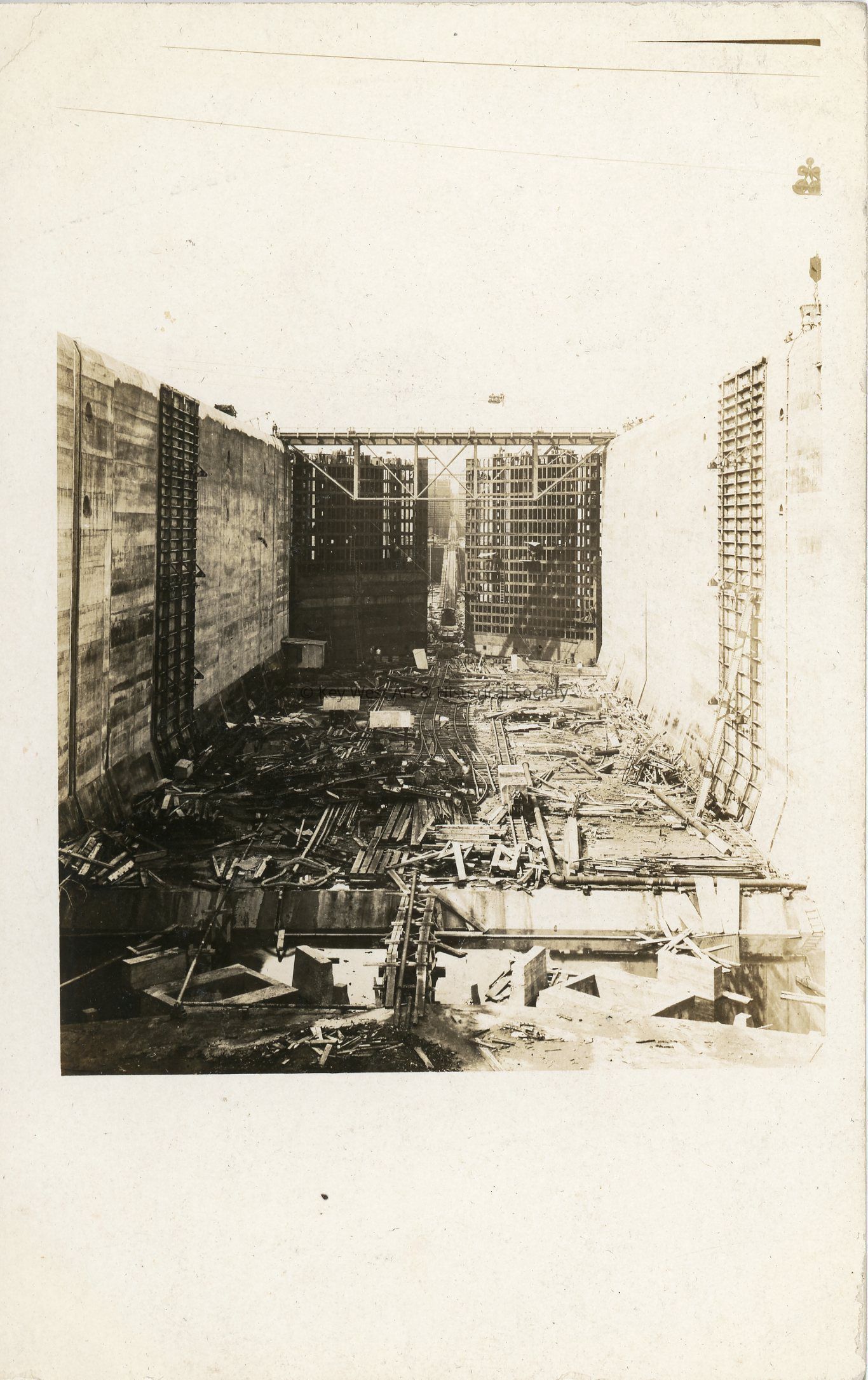 This is a view taken in the lower lock at Gatun showing a section of form for placing concrete still in place als [sic] one of the gates under construction, this is about where the artist that drew the future in the N.Y. Times I sent you stood. Taken about Sept 1912Language