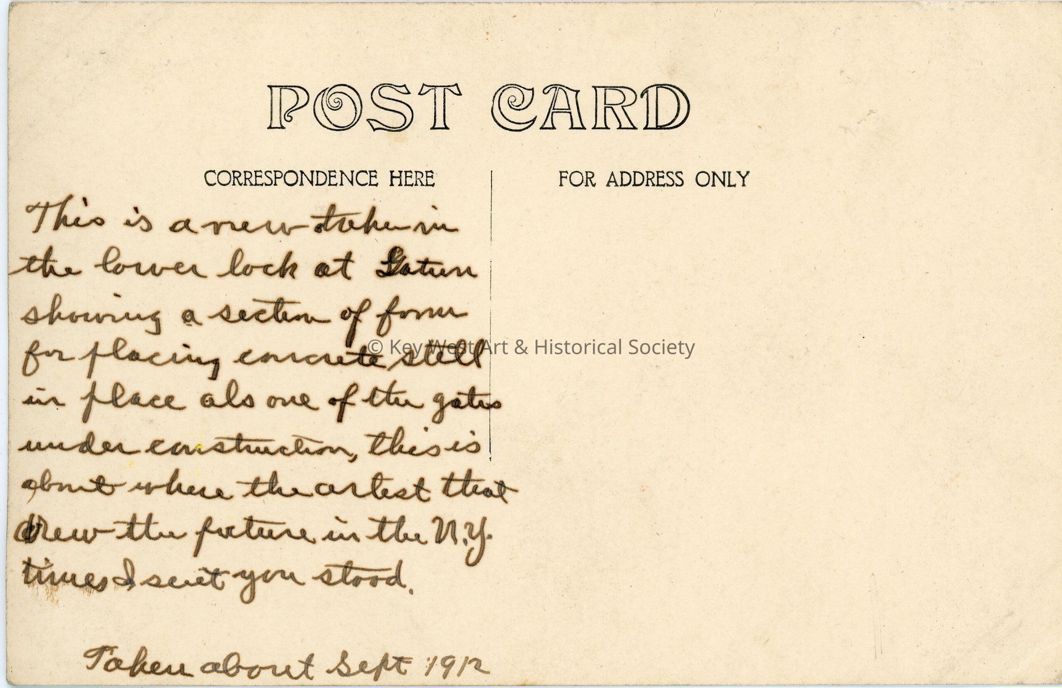 Black and white photograph postcard depicting the construction of the Panama Canal. The photo shows the lower lock at Gatun Locks while the gate was under construction. Dated September 1912. Verso has a handwritten note.Subject