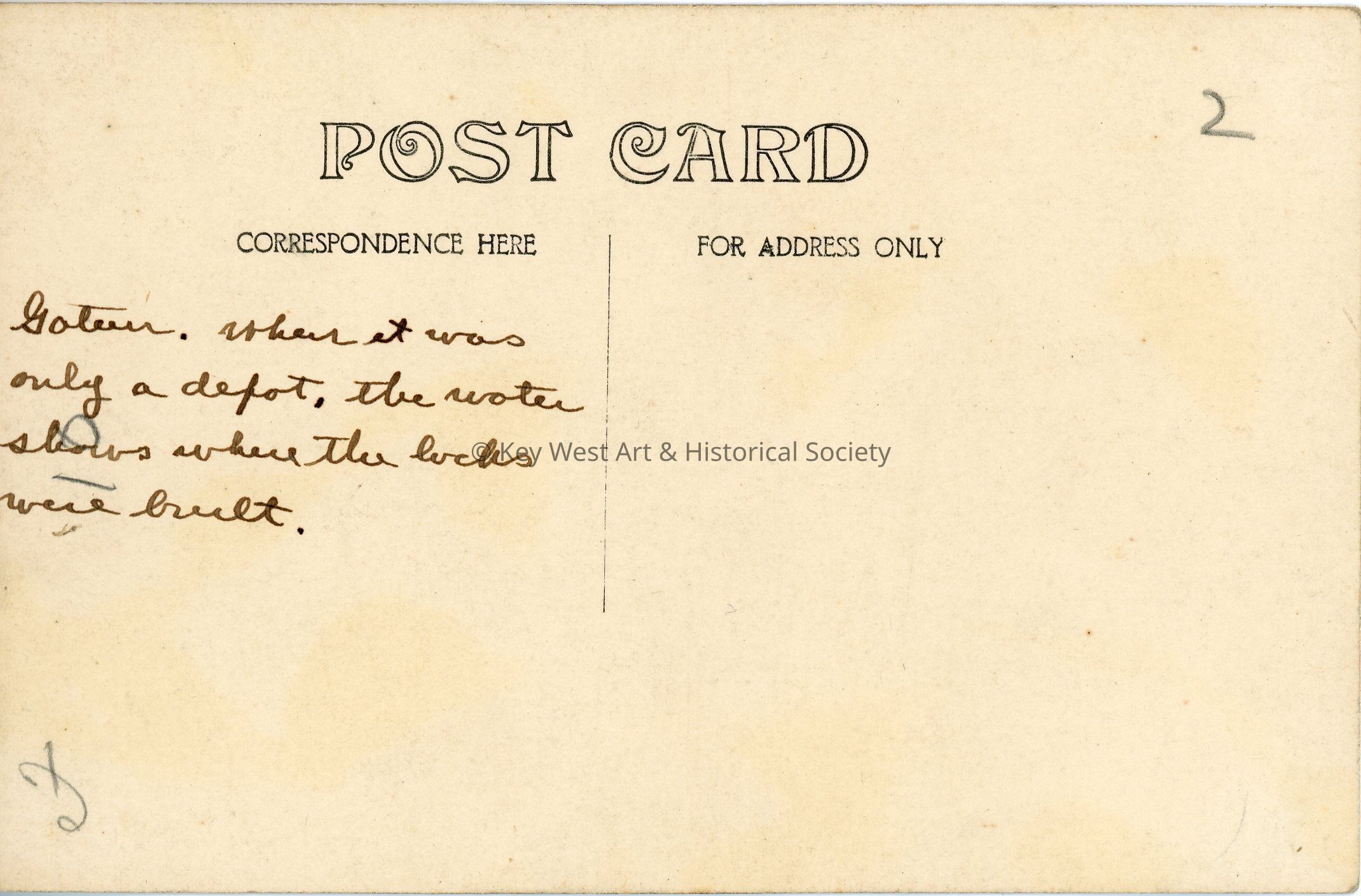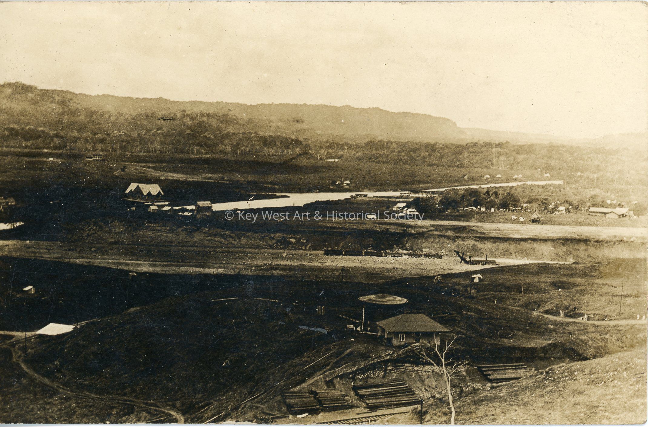 Black and white photograph postcard depicting Gatun during the construction of the Panama Canal. The photograph shows a heavily deforested area. Writing on verso reads: 'Gatun. When it was only a depot, the water shows where the locks were built.'Subject