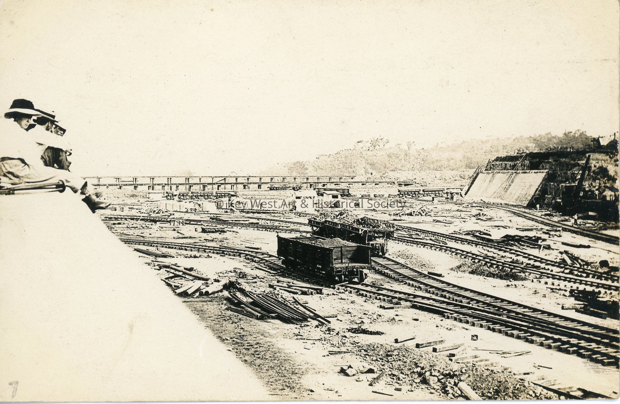 Black and white photograph postcard depicting the construction of the Panama Canal near the town of Gatun. The photograph shows a large trench with multiple lines of railroad tracks and loaded cars. There are people sitting to the left looking out over the work. Verso has handwritten note.Subject