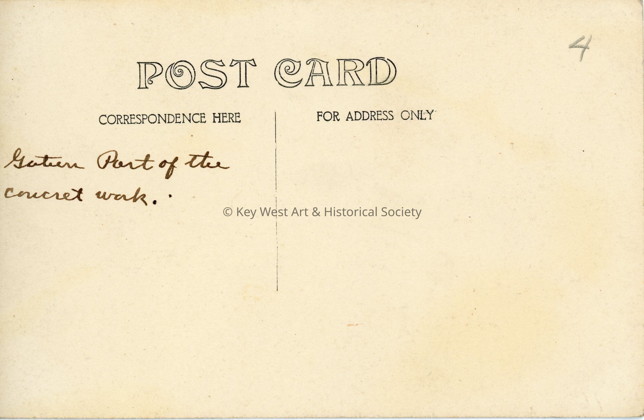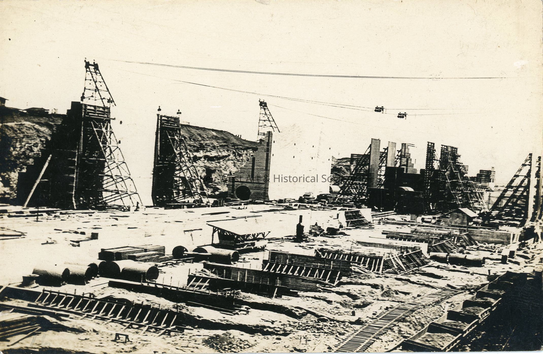 Black and white photograph postcard depicting the construction of the Panama Canal near the town of Gatun. Handwriting on verso reads: 'Gatun Part of the concret [sic] work.'Subject