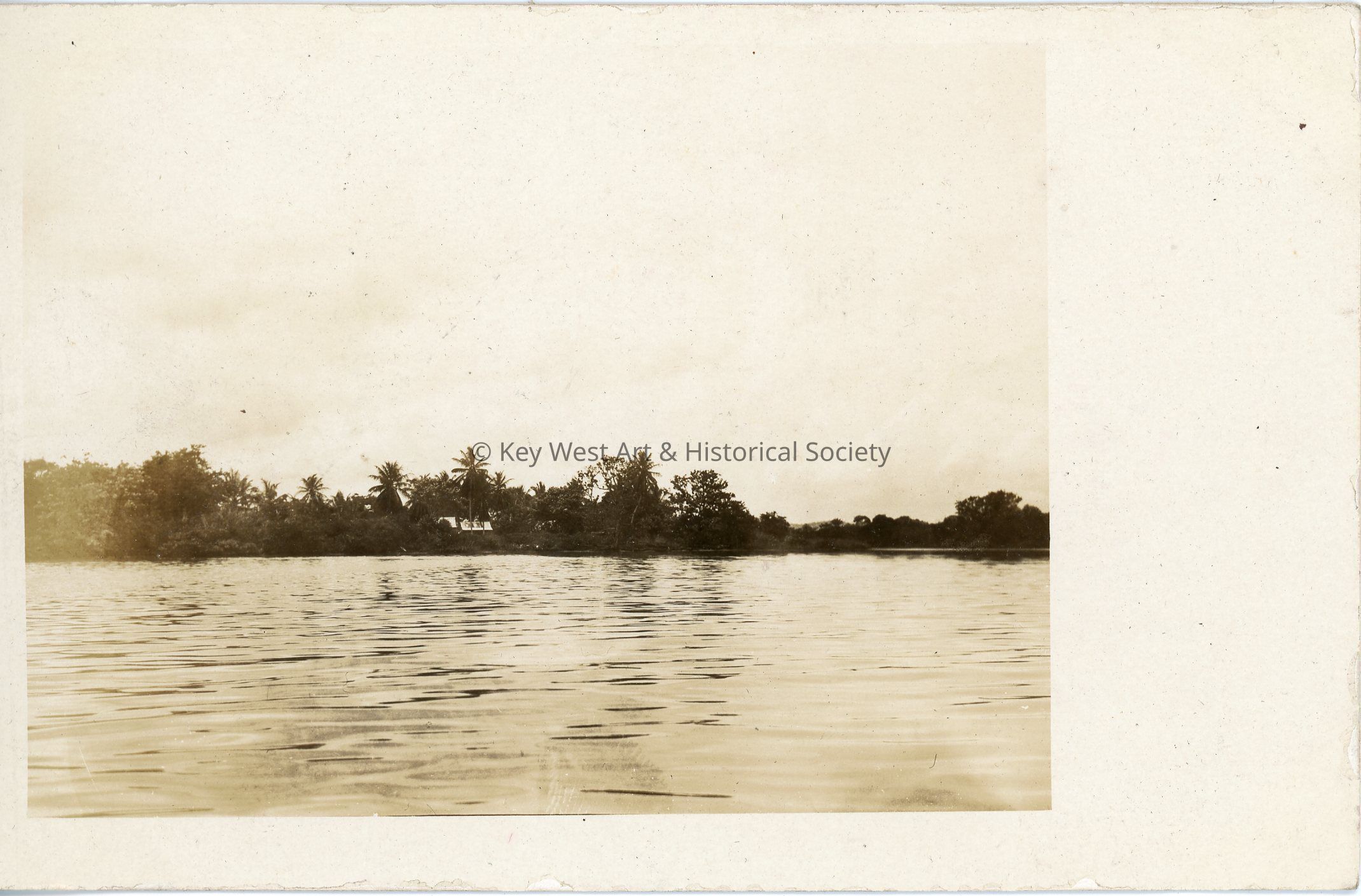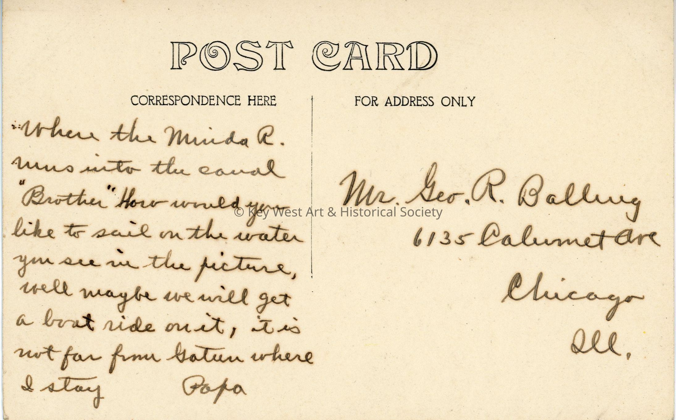 Black and white photograph postcard depicting where a tributary runs into the Panama Canal. The writer calls it the 'Minda River.' The postcard is addressed to Mr. Geo. R. Balling. Verso has a handwritten note.Subject