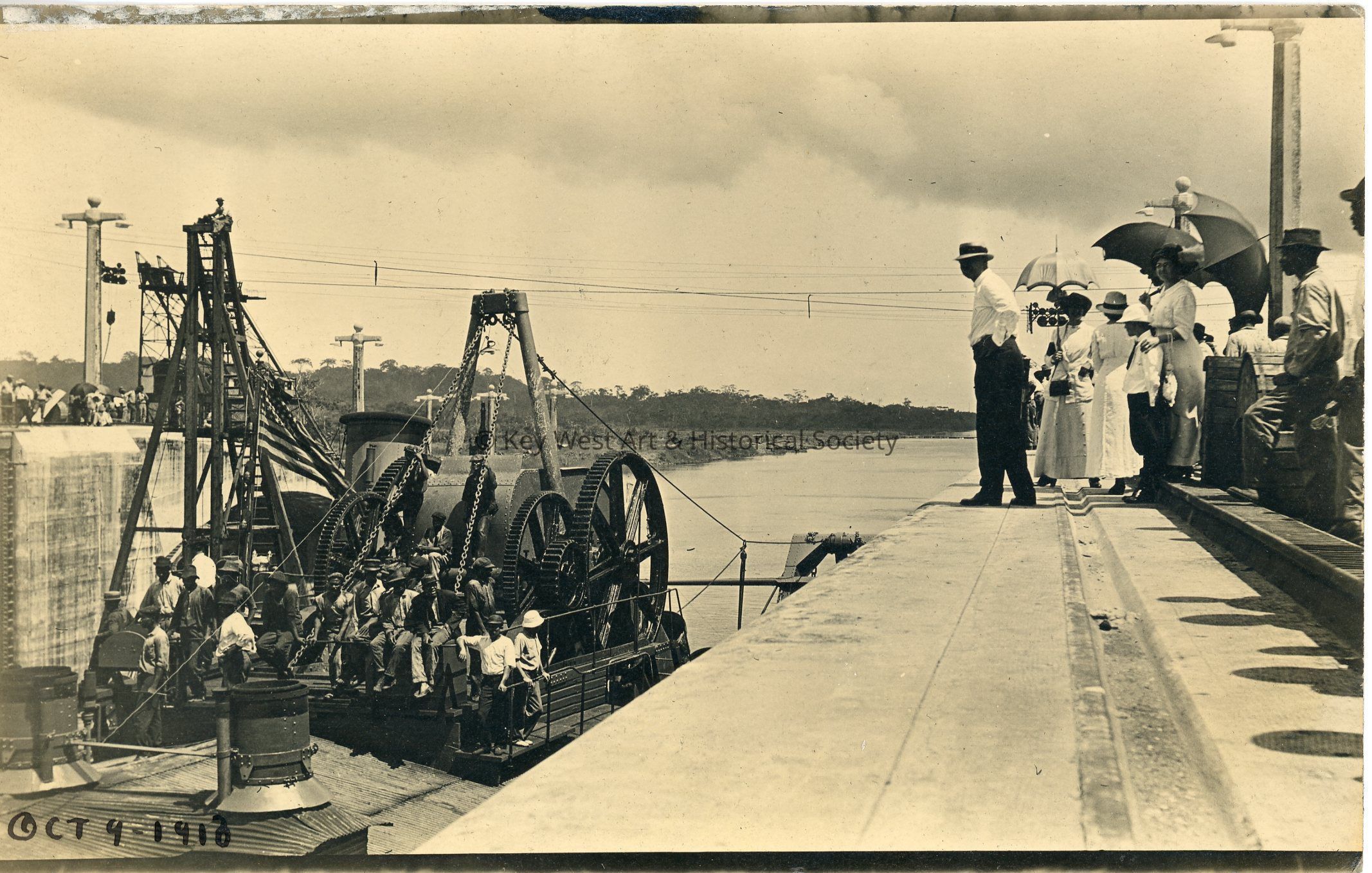 Black and white photograph postcard depicting many people watching boats pass by at what is likely the Gatun Locks. The photograph shows a ship with heavy construction equipment and workers floating past. The photograph is dated October 9, 1913.Subject
