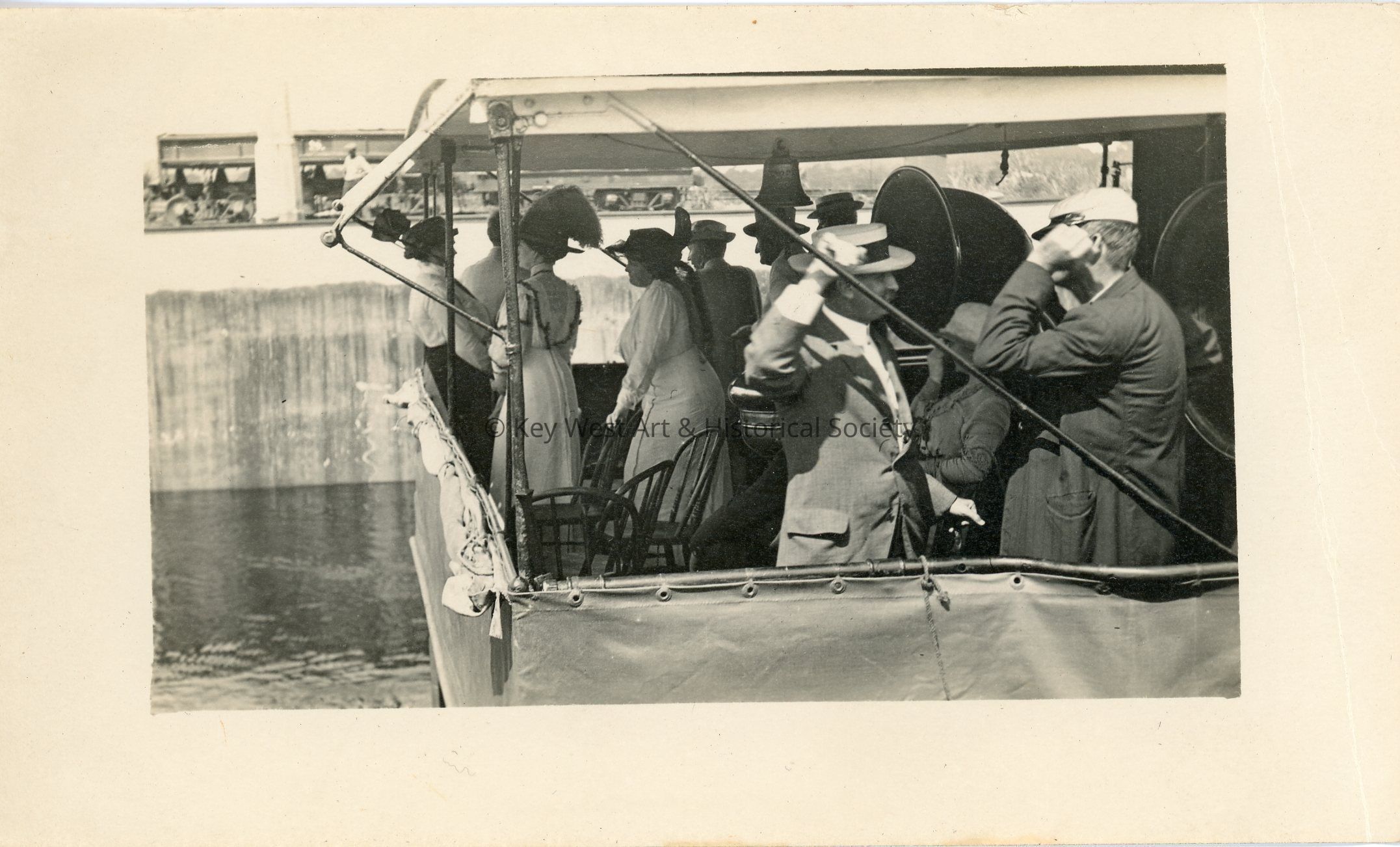 Black and white photograph depicting the upper deck of the dredging boat named U.S. Clapet No. 4 with passengers. Used during construction of the Panama Canal, this dredge was taken and used by the United States Navy during World War I. The vessel was returned after the war. The photograph was designed to be attached to a postcard backing.