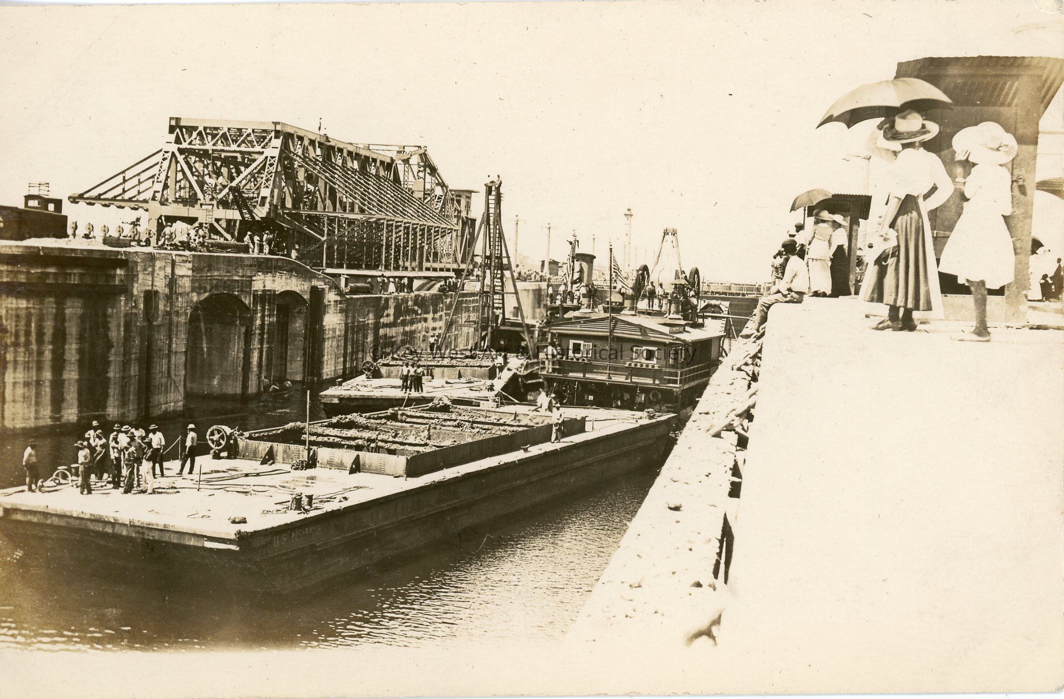 Black and white photograph postcard depicting men, women, and children watching barges move through the Panama Canal. The photograph shows what is likely the Gatun Locks. The postcard is addressed to Mrs. Geo. A. Balling.Subject