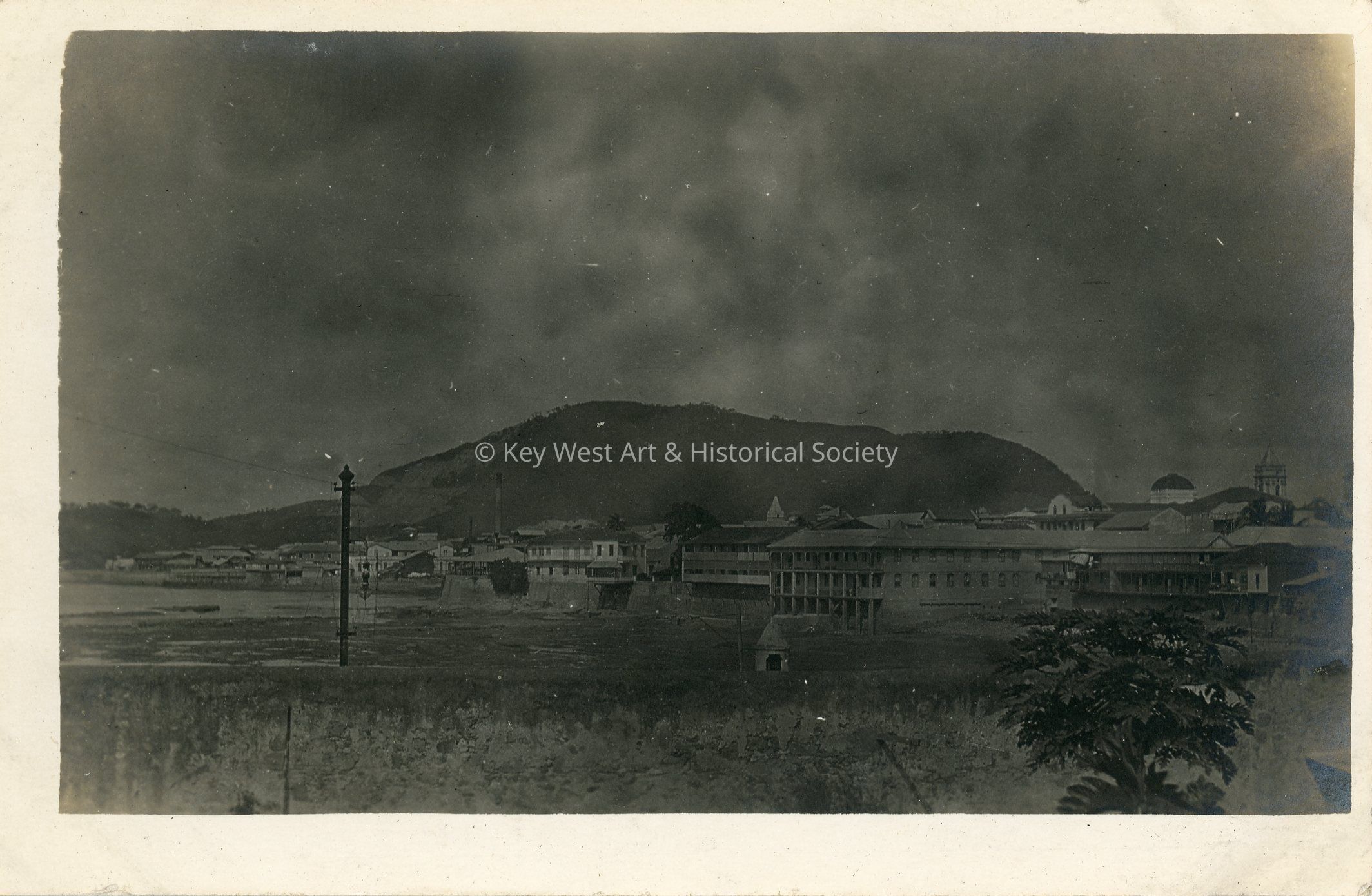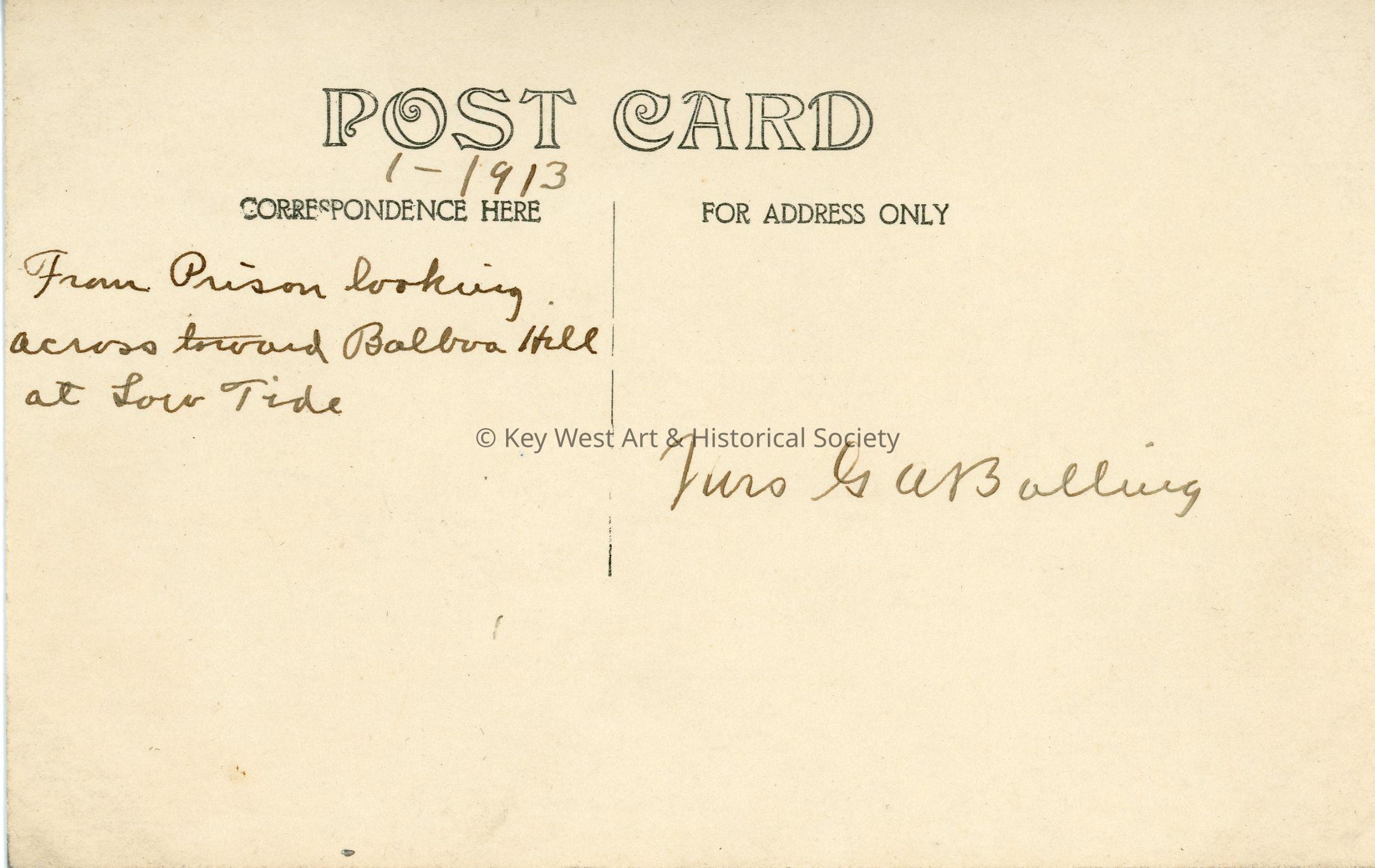 Black and white photograph postcard depicting low tide at what is ostensibly Panama City with Balboa Hill in the background. The postcard is addressed to Mrs. G.A. Balling. Verso has a handwritten note.Subject