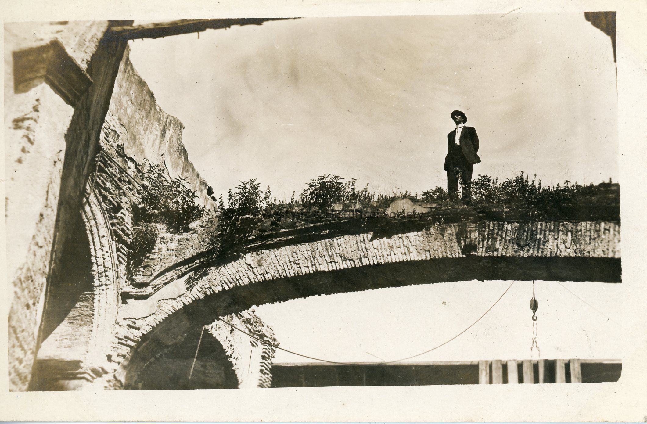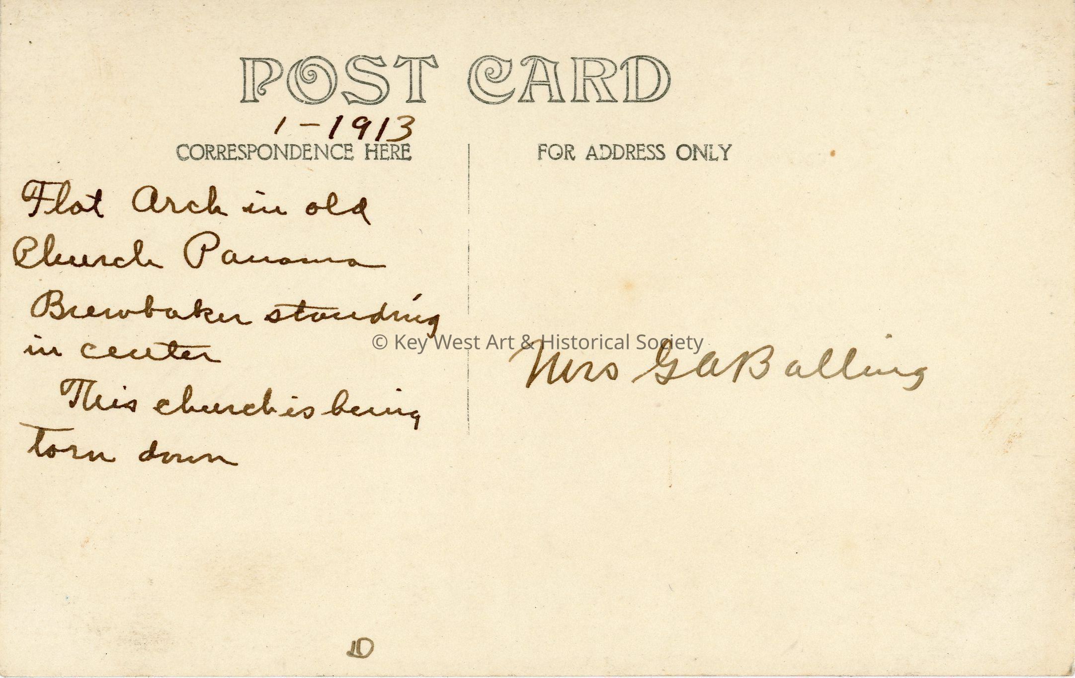 Black and white photograph postcard depicting a man named W. W. Brewbaker standing on an arch in an old church in Panama City. The postcard is dated January 1913 and is addressed to Mrs. G.A. Balling. Verso has a handwritten note.Subject