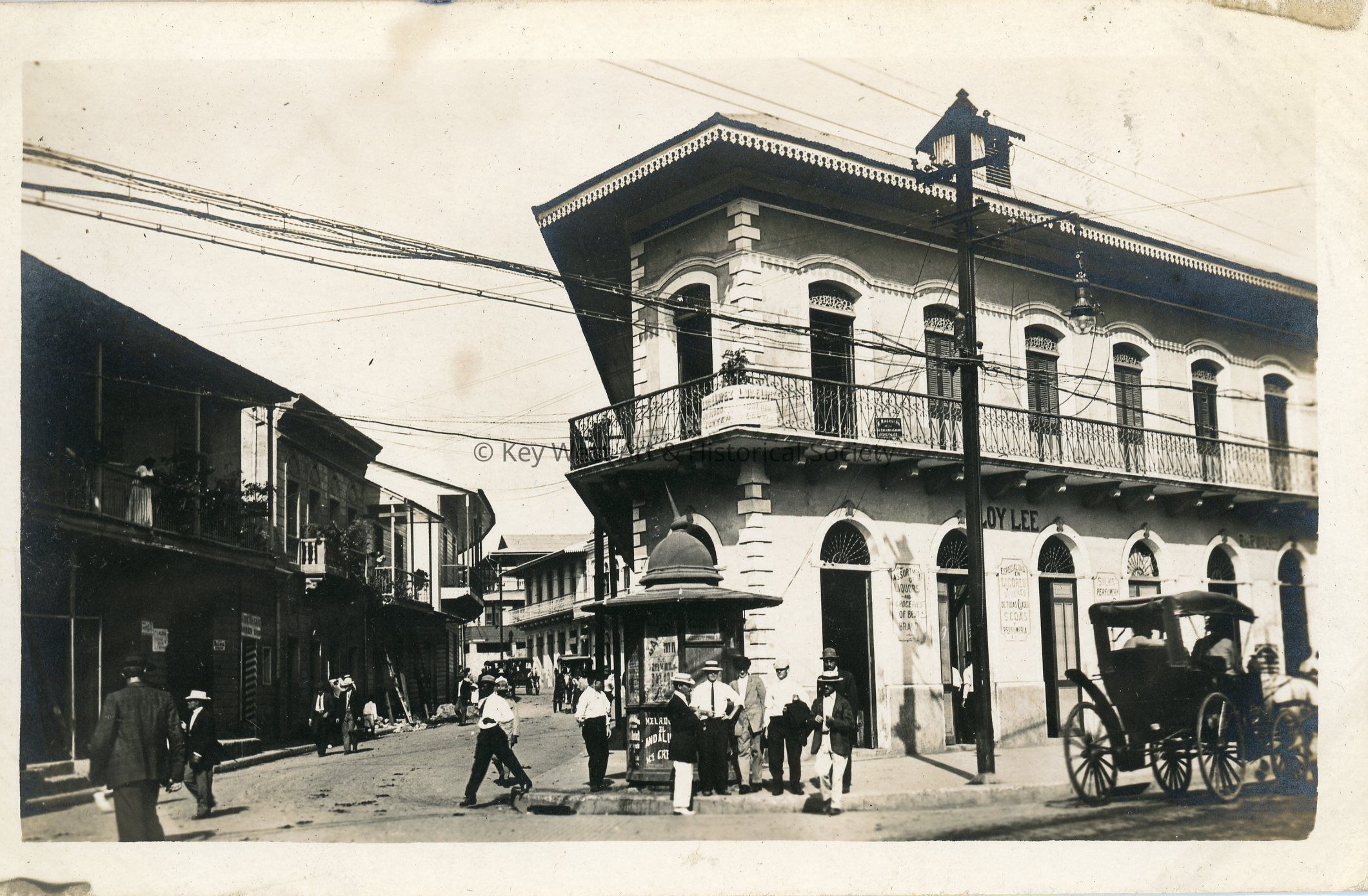 Black and white photograph postcard depicting the streets of Panama City, showing shops, pedestrians, and horse drawn carriages. The postcard is dated January 1913 and is addressed to Mrs. G.A. Balling. Verso has a handwritten note.Subject