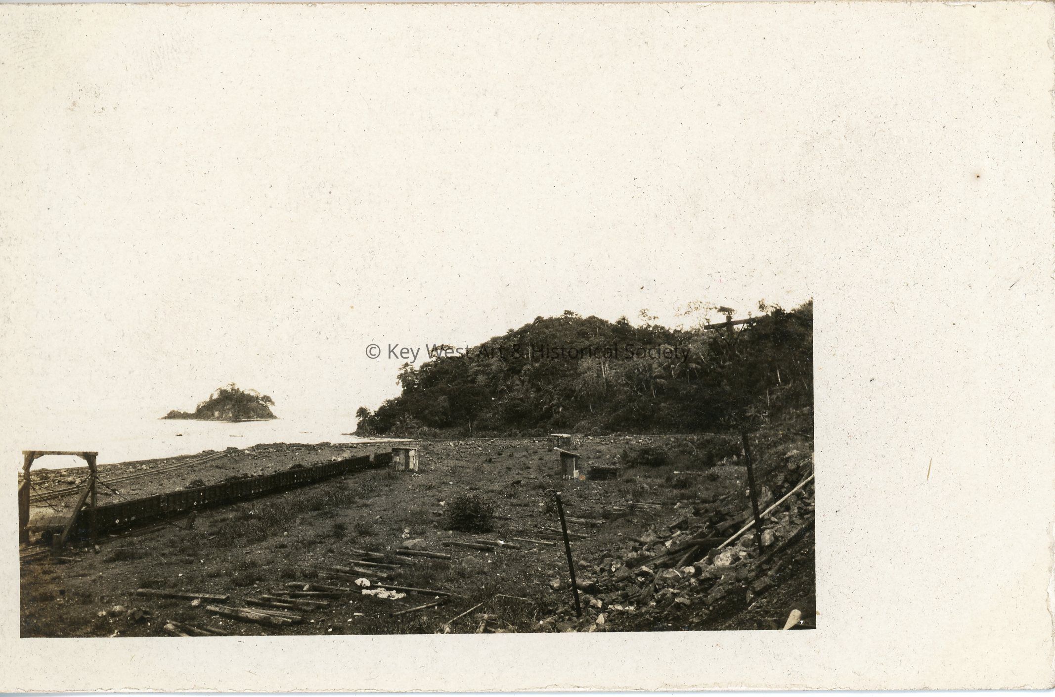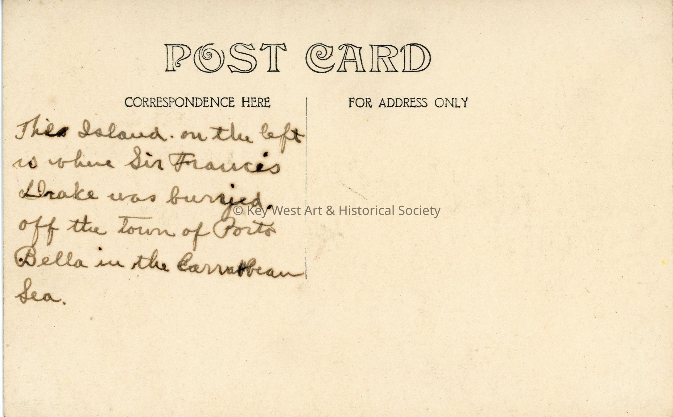 Black and white photograph postcard depicting the Panama coast near the town of Portobelo. The writer of the postcard claims the small island is where Sir Francis Drake was buried. Verso has a handwritten note.Subject