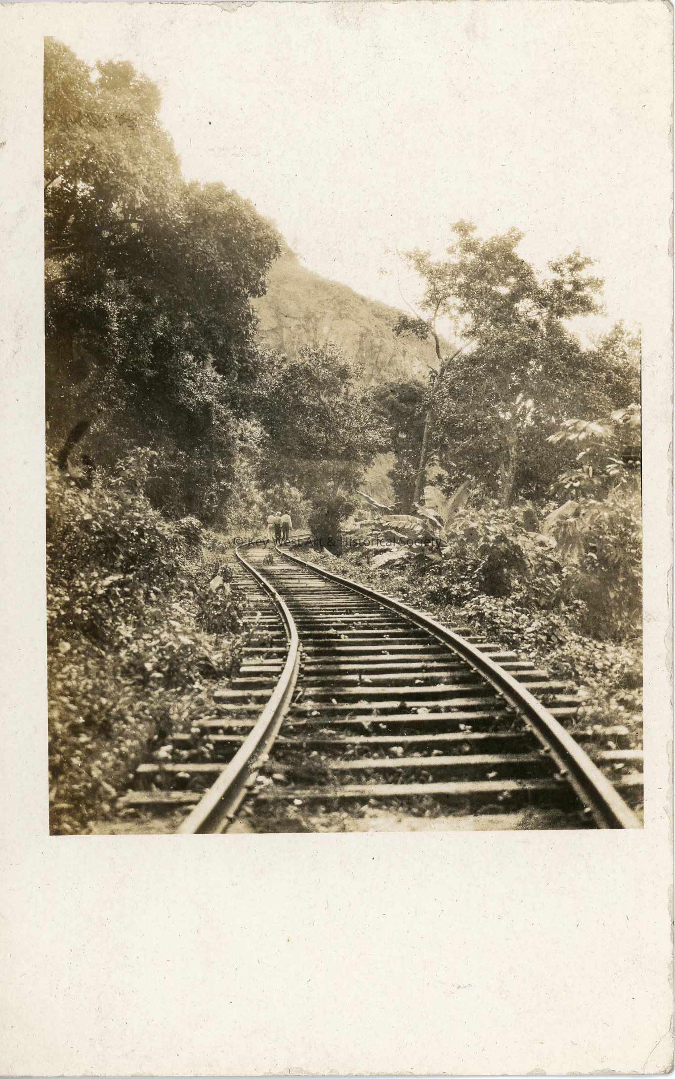 Black and white photograph postcard depicting a Panama railroad with surrounding jungle. Verso has a handwritten note.Subject
