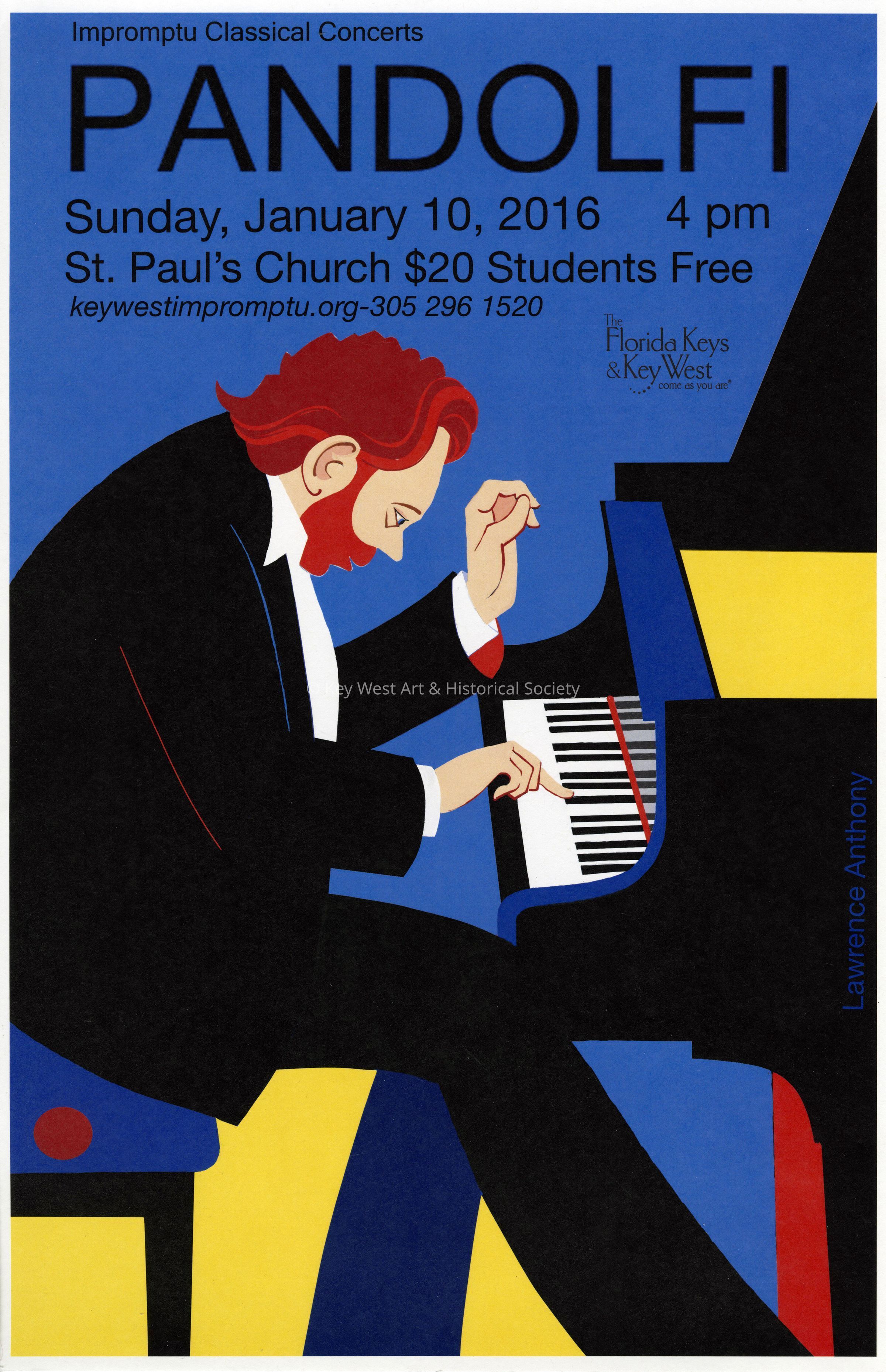 An advertising poster for Impromptu Classical Concerts featuring Pandolfi. The concert took place on January 10, 2016 at St. Pauls Church in Key West. The poster was designed by Lawrence Anthony.Collection