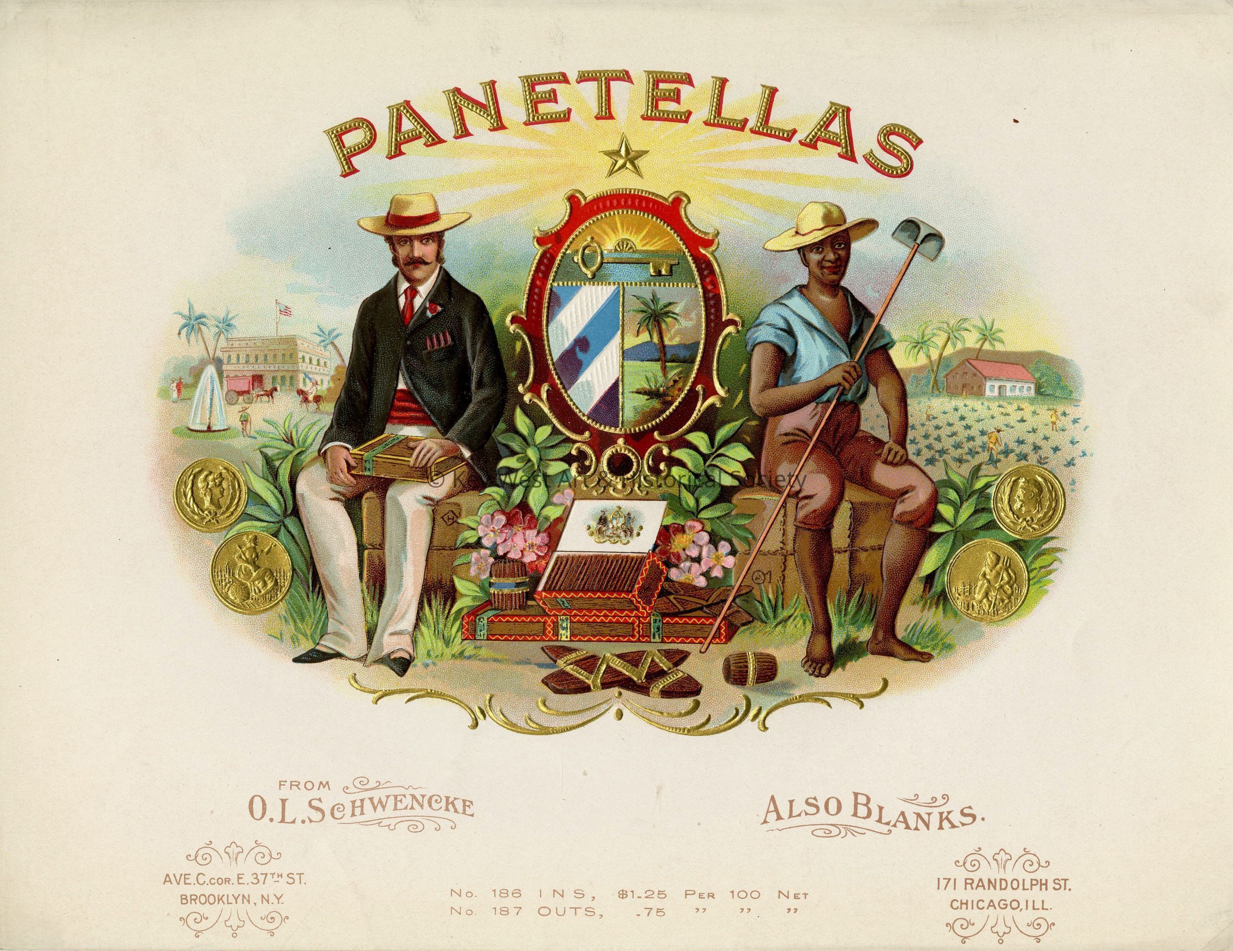 Full color lithograph inner cigar box label promoting Panetellas. Likely taken from a sample book produced by the lithographer.Type of Print