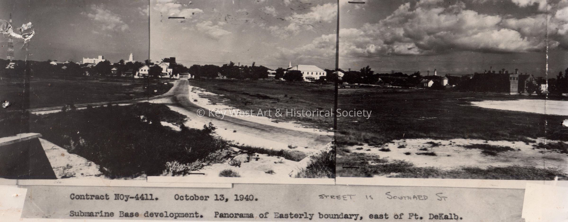 Black and white panorama of the eastern boundary (east of Fort Dekalb) of the U.S. Naval Submarine Base development at Naval Station Key West. The pictured street is Southard Street looking eastward.