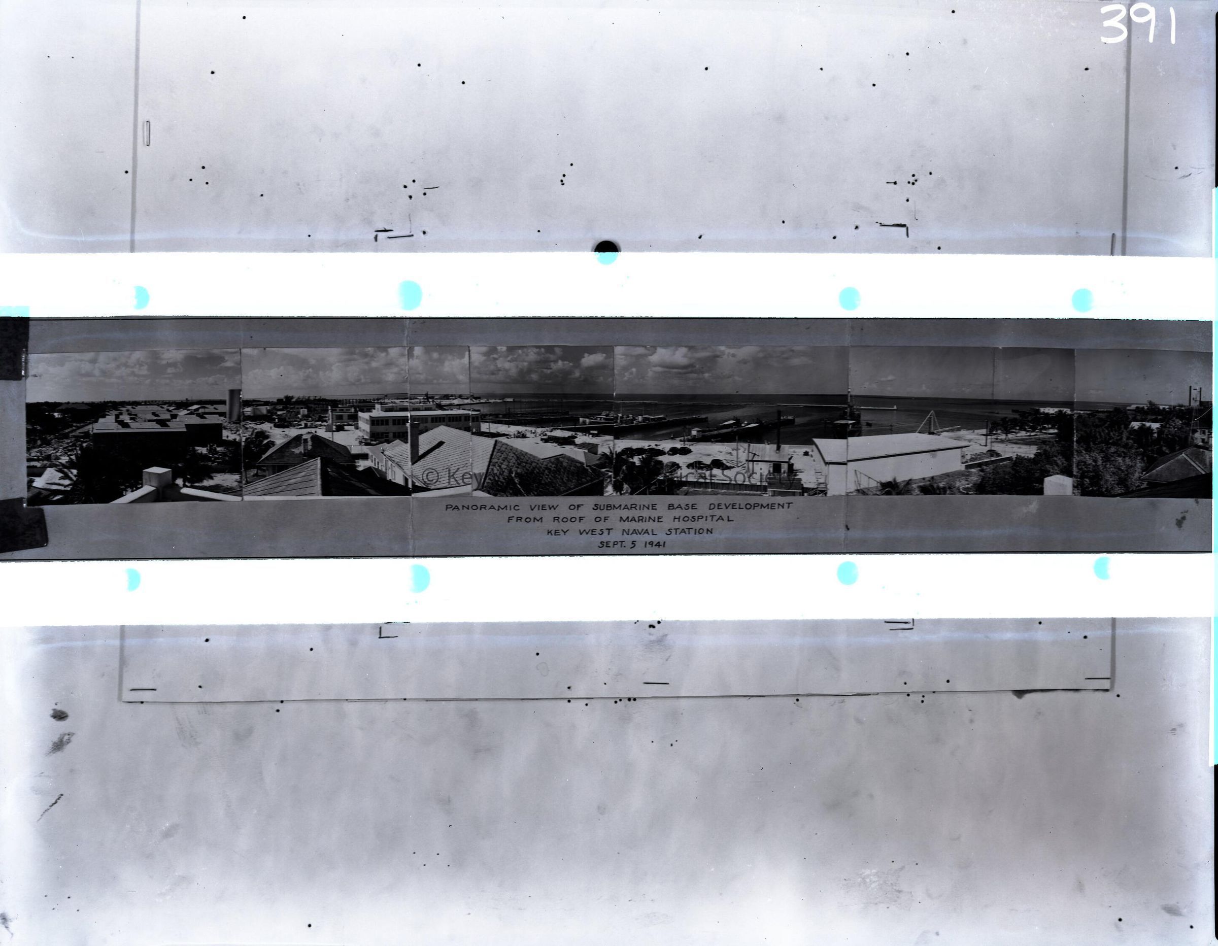 Black and white panoramic negative view of the U.S. Naval Submarine Base development at Naval Station Key West taken from the roof of the Marine Hospital.