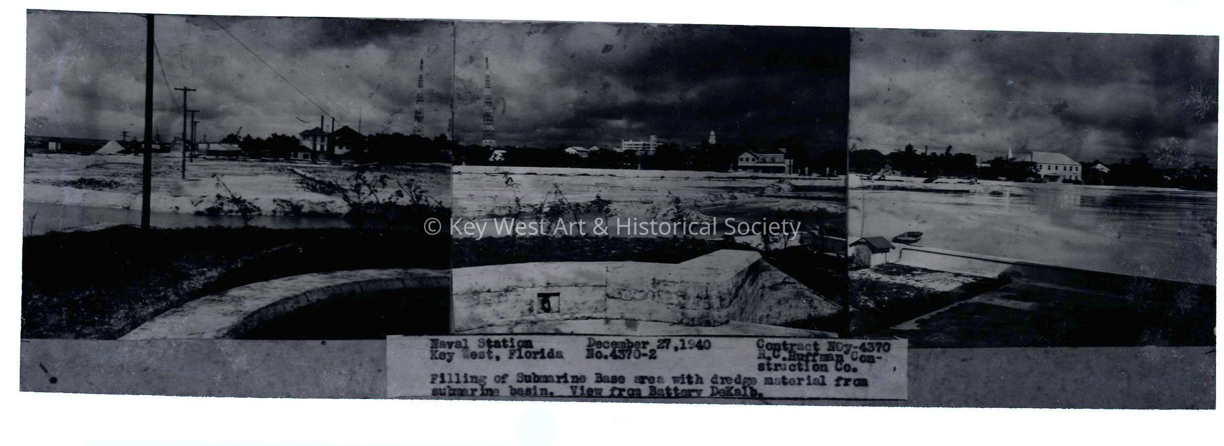 Black and white negative panorama view from Battery Dekalb at theU.S. Naval Submarine Base at Naval Station Key West. The base area is being filled with dredge from the submarine basin.