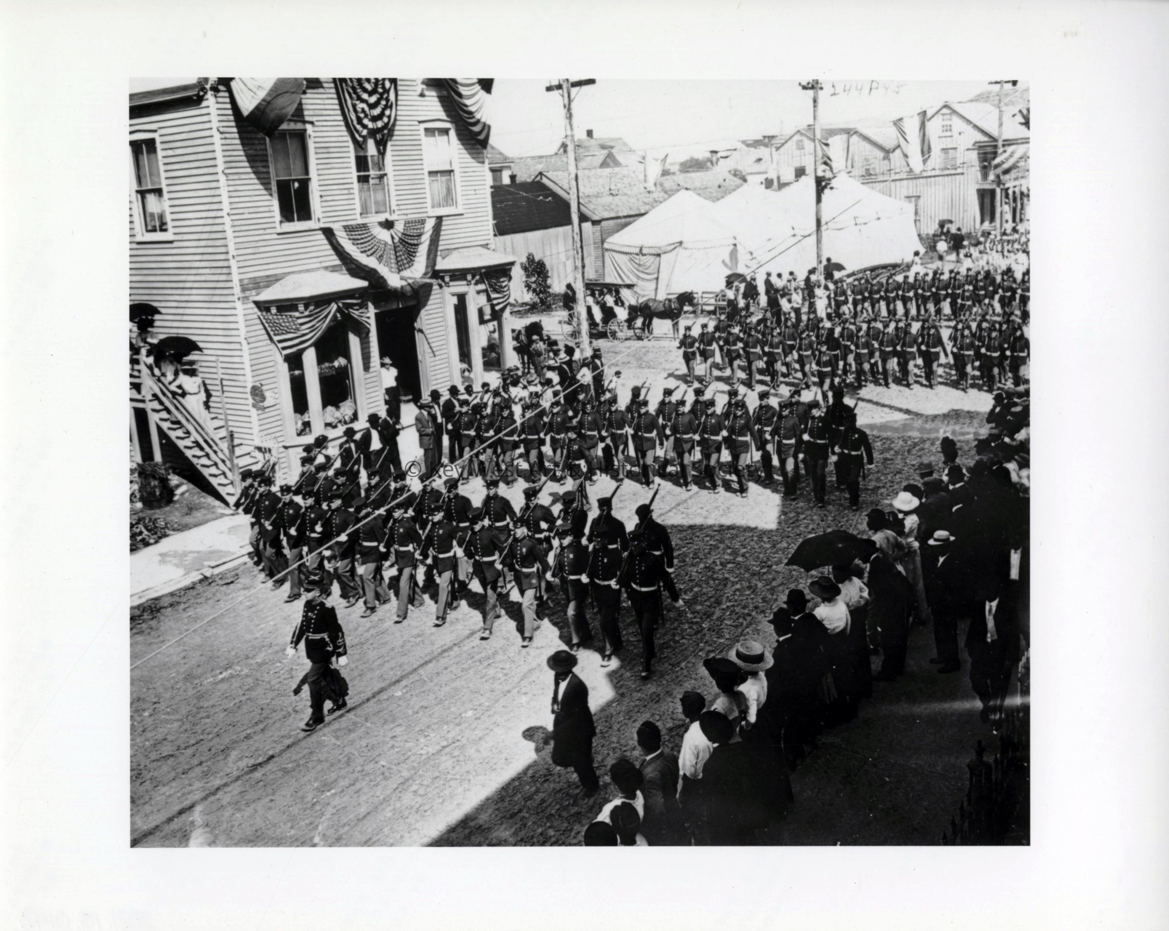 Black and white photograph of a parade celebrating the arrival of the first Florida East Coast Railway train at the Key West depot. A week-long celebration was planned for the residents and visiting dignitaries.
