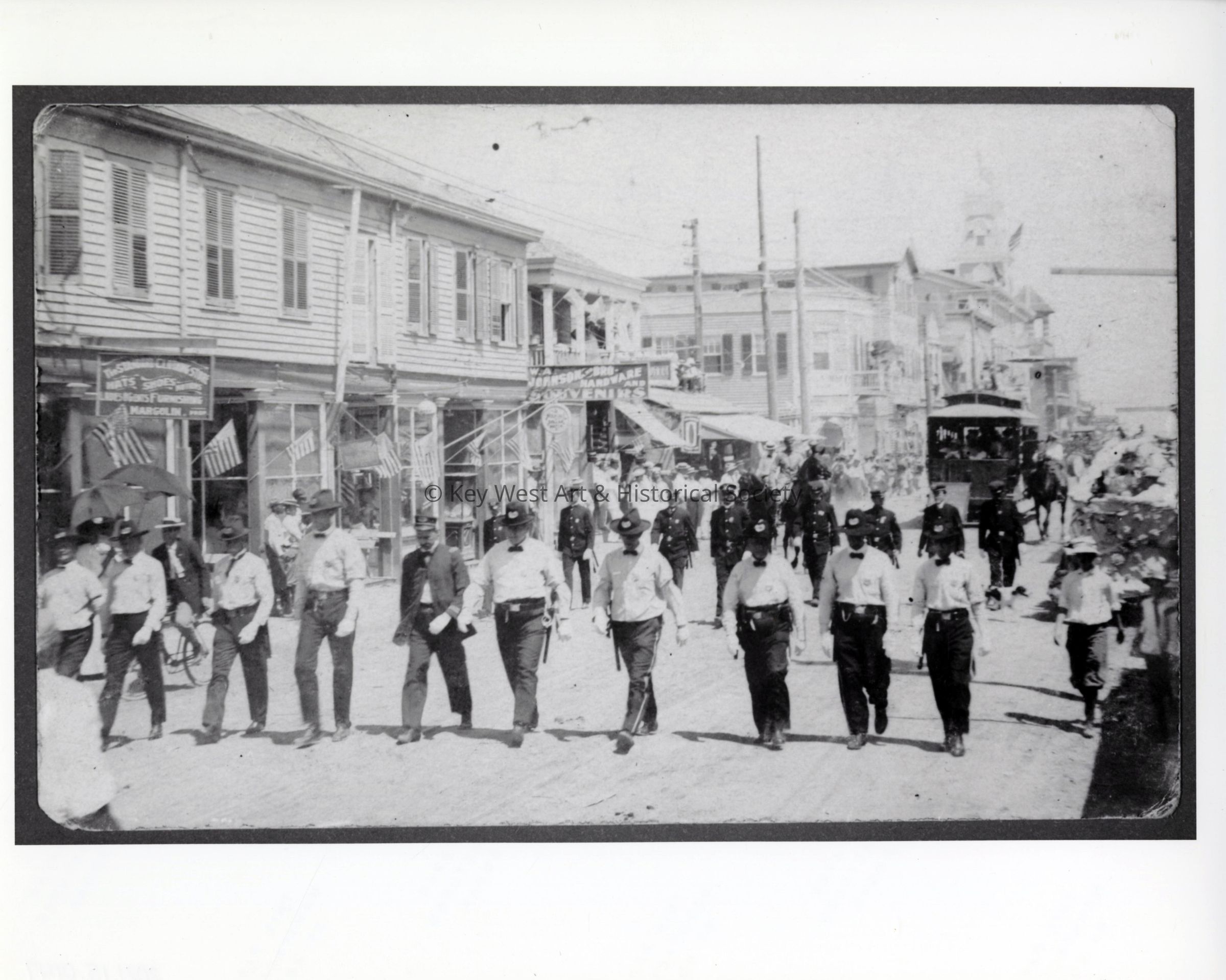 Black and white photograph of a parade on the 200 block of Duval Street celebrating the arrival of the first Florida East Coast Railway train at the Key West depot. A week-long celebration was planned for the residents and visiting dignitaries.