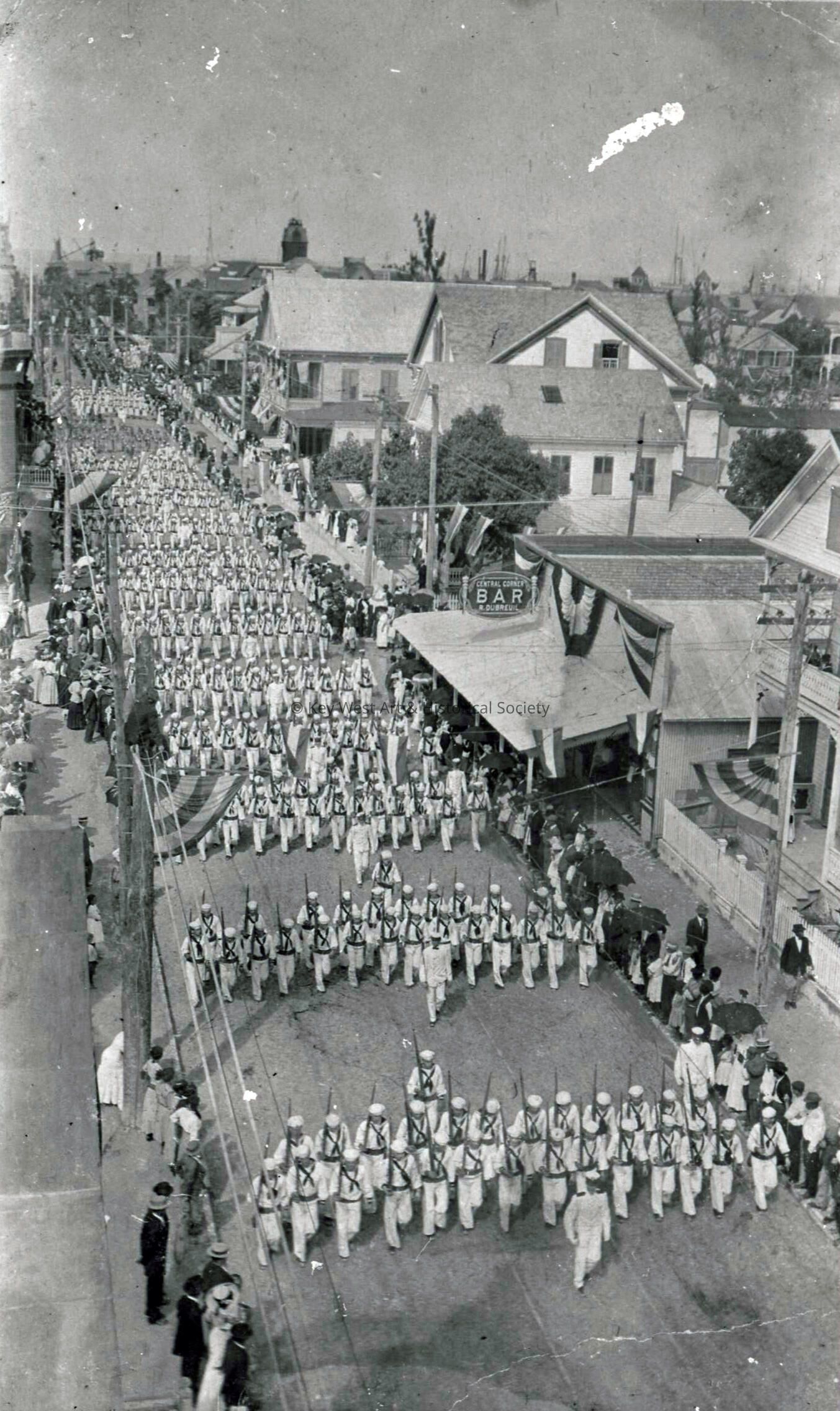 Black and white negative of a parade on the 500 block of Duval Street celebrating the arrival of the first Florida East Coast Railway train at the Key West depot. A week-long celebration was planned for the residents and visiting dignitaries. Central Corner Bar is visible in the lower right.Photograph Details
