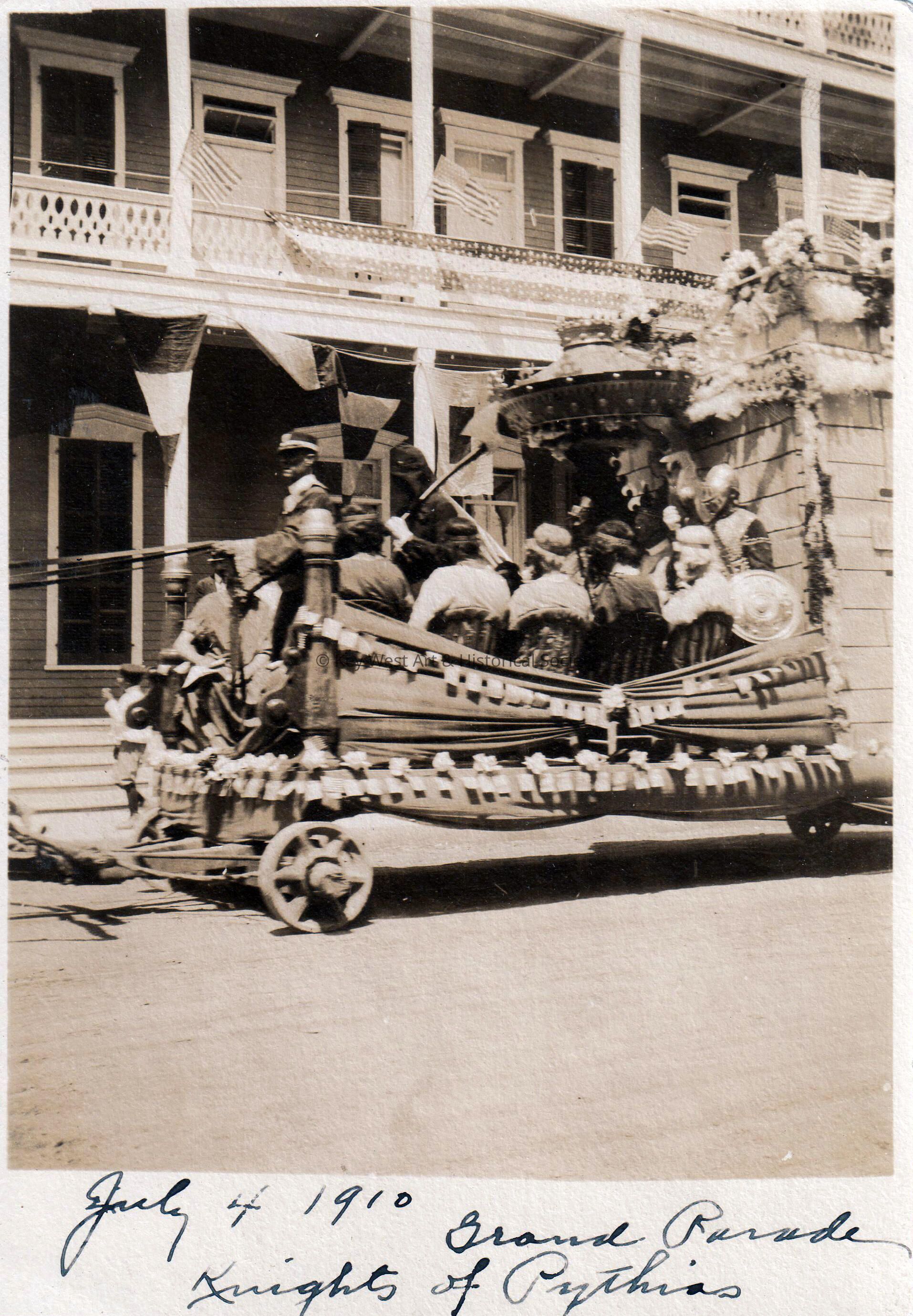 Black and white photograph of a July 4th parade float traveling on the 100 block of Duval Street. Caption on photo reads, 'July 4, 1910 Grand Parade Knights of Pythias. Float is in front of the Jefferson Hotel'.