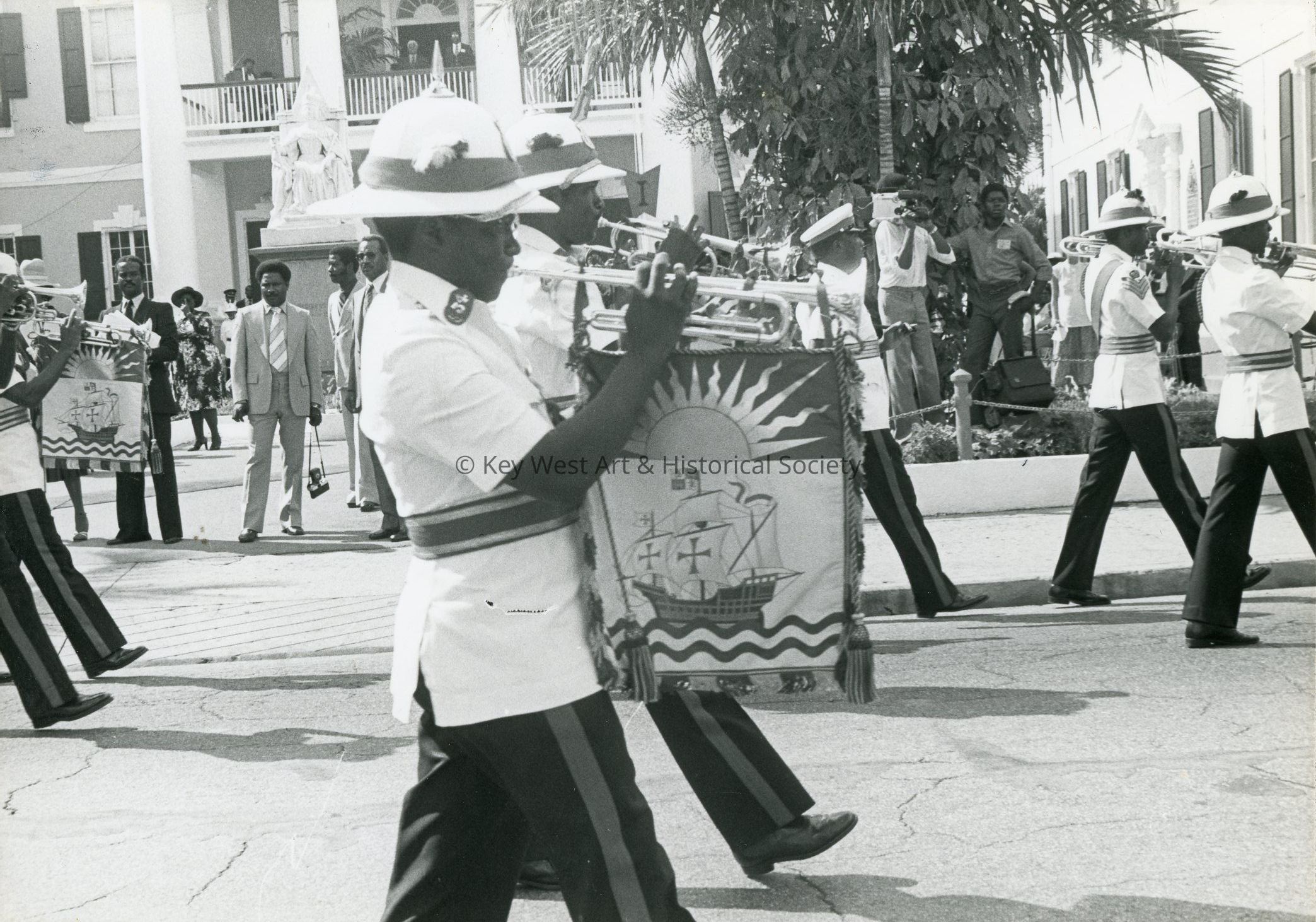 Black and white photograph of a Bahamian marching band passing in front of Parliament Square in Nassau, Bahamas