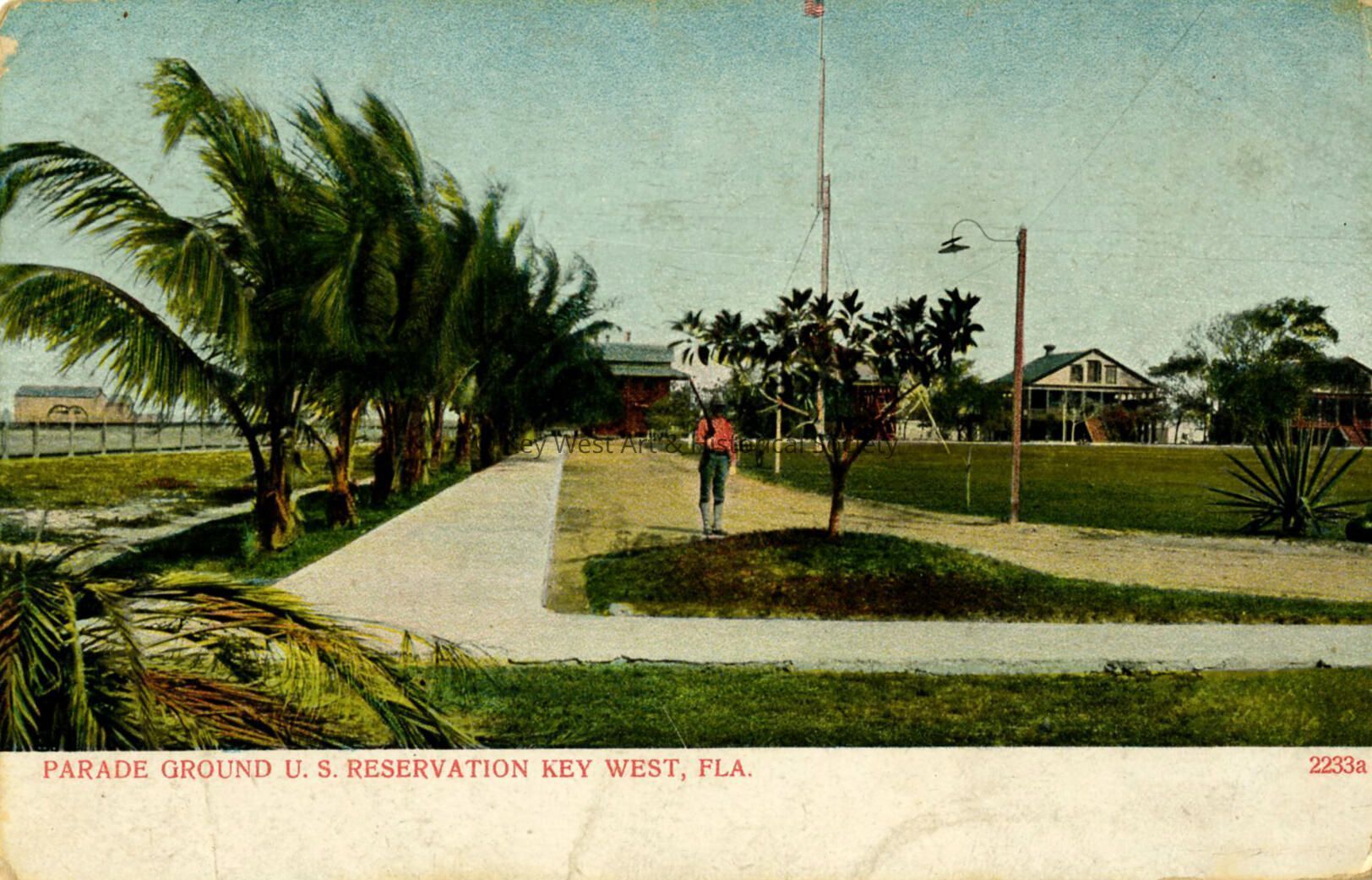 Postcard depicting the U.S. Army barracks and Parade Grounds on the present-day site of Peary Court. The caption reads, 'Parade Ground U.S. Reservation Key West, Fla.'Subject Person/Organization