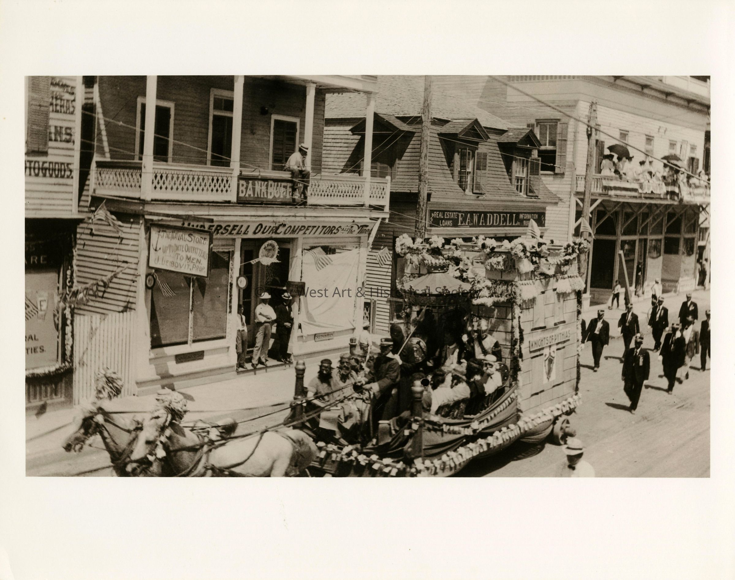 Black and white photograph of a parade on the 100 block of Duval Street.