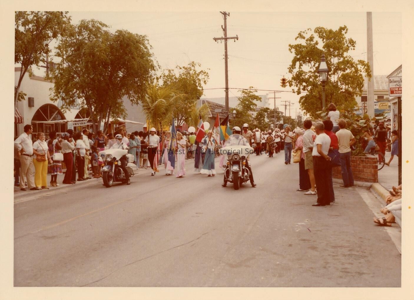 Color photograph of a parade on the 600 block of Duval Street taken during the Island Roots Festival.
