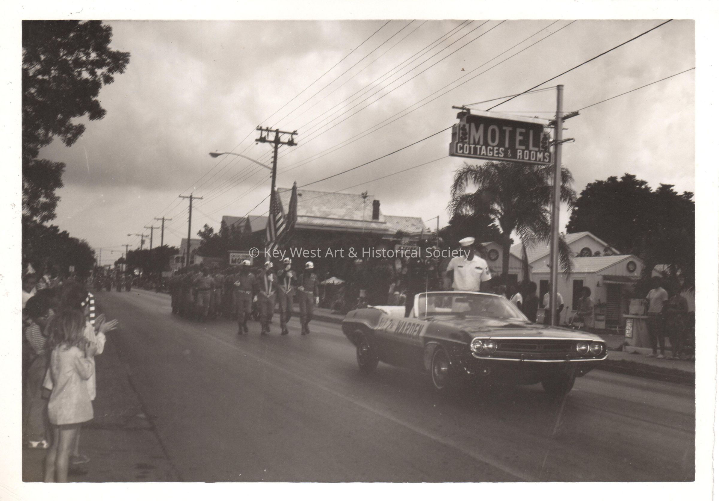 Black and white photograph of military members in a parade on Truman Avenue.Photograph Details