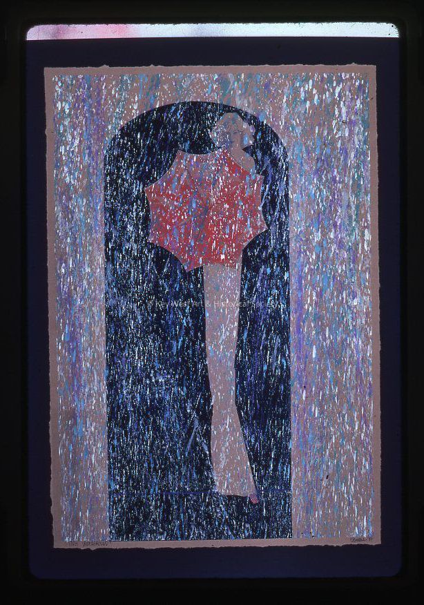 35mm color slide depicting the painting 'Paris Underground' by Ron Clemons. The work shows a woman standing in an arched doorway holding a red umbrella while rain falls before her. The original painting was completed in 1987.