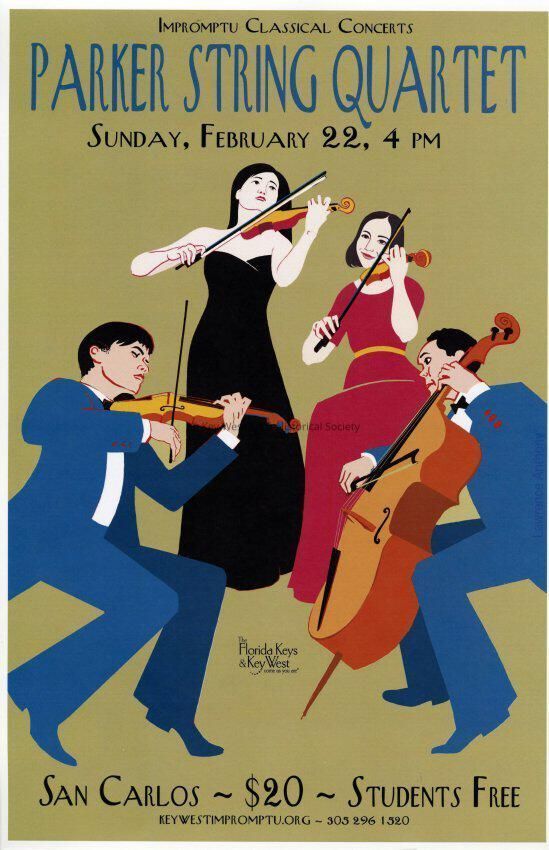 An advertising poster for Impromptu Classical Concerts featuring the Parker String Quartet. The concert took place on February 22, 2015 at St. Pauls Church in Key West. The poster was designed by Lawrence Anthony.Collection