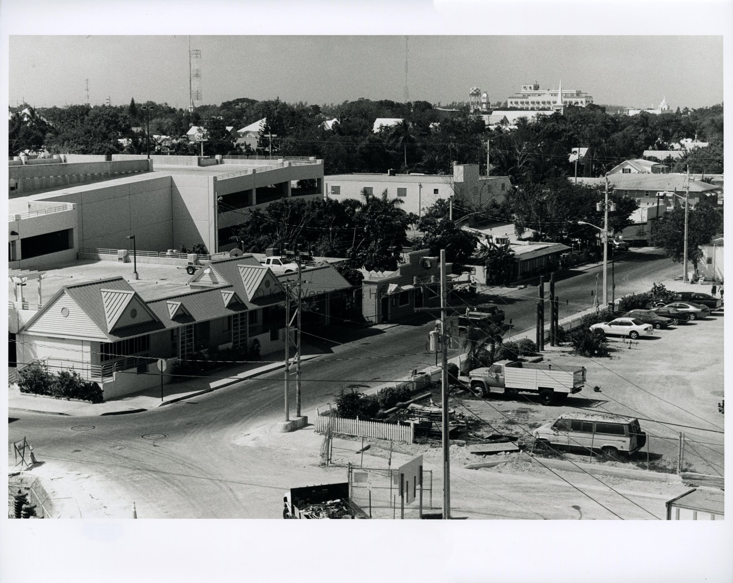 Black and white photograph of the new parking garage on the corner of Grinnell and Caroline streets. PT's Restaurant is to its right and the La Concha Hotel is visible in the distance.