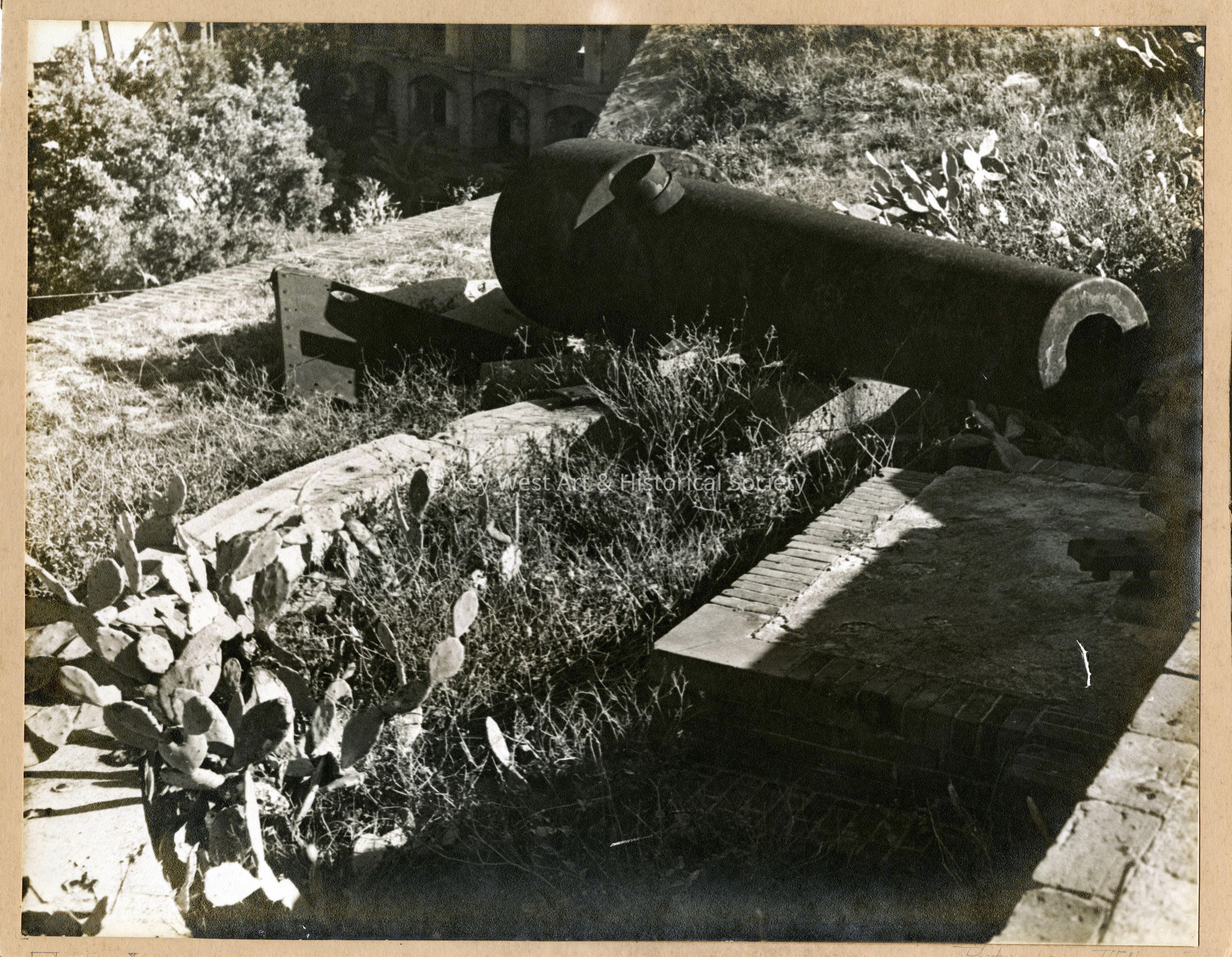 Black and white photograph of a Parrott Rifle at Fort Jefferson in the Dry Tortugas. Caption on verso reads, 'Ft. Jefferson. Parrot [sic] gun on the terreplein. The Rifled Parrot [sic] gun came into use during the war between the States and spelled the doom of masonry forts.'