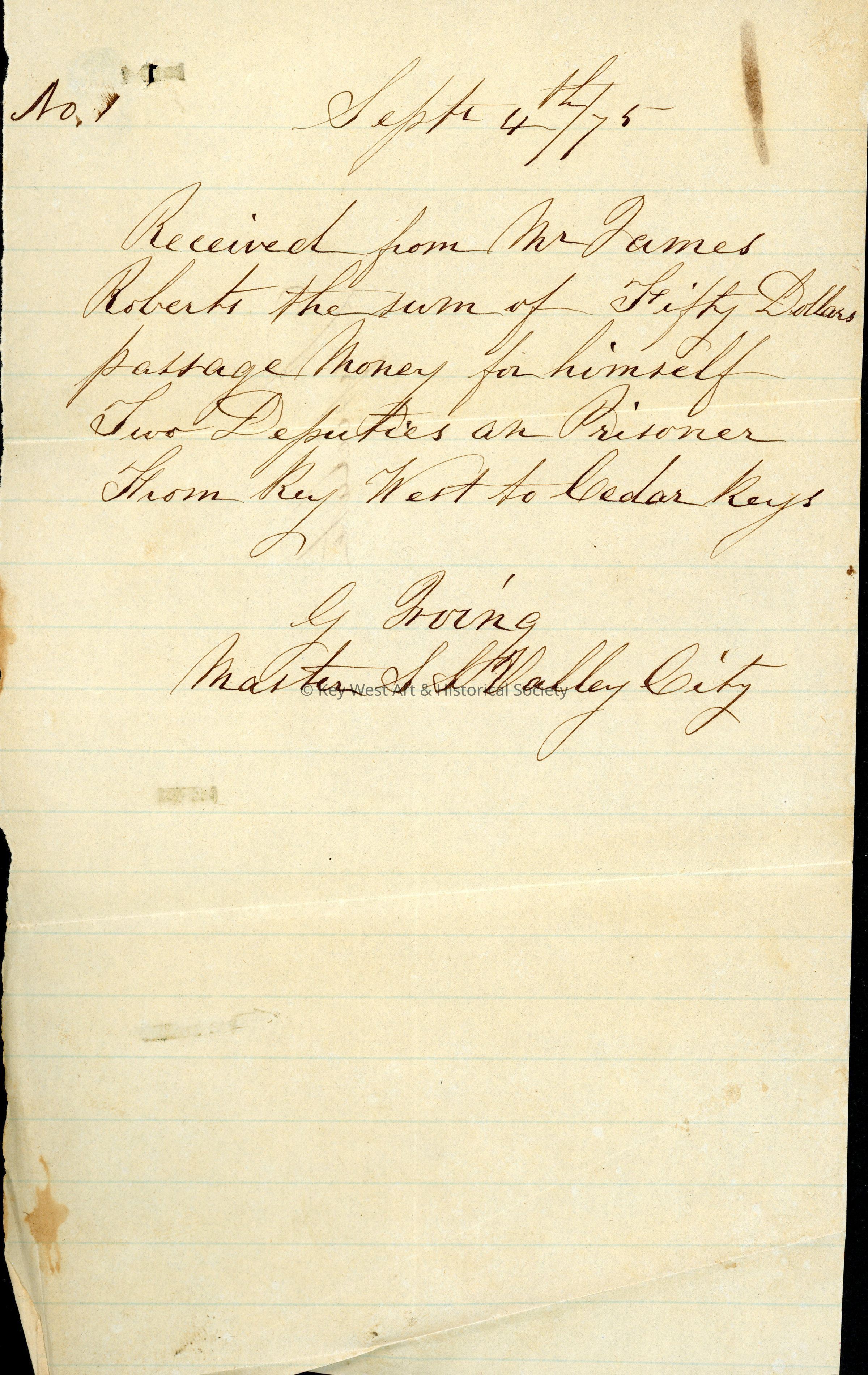 Note signifying the payment of fifty dollars ($50) from Mr. James Roberts to G. Irving, the Master of the SS Valley City. The fee was for the transportation of Roberts, two (2) deputies, and a prisoner from Key West to Cedar Keys. The back of the receipt reads 'Duplicate.'Collection