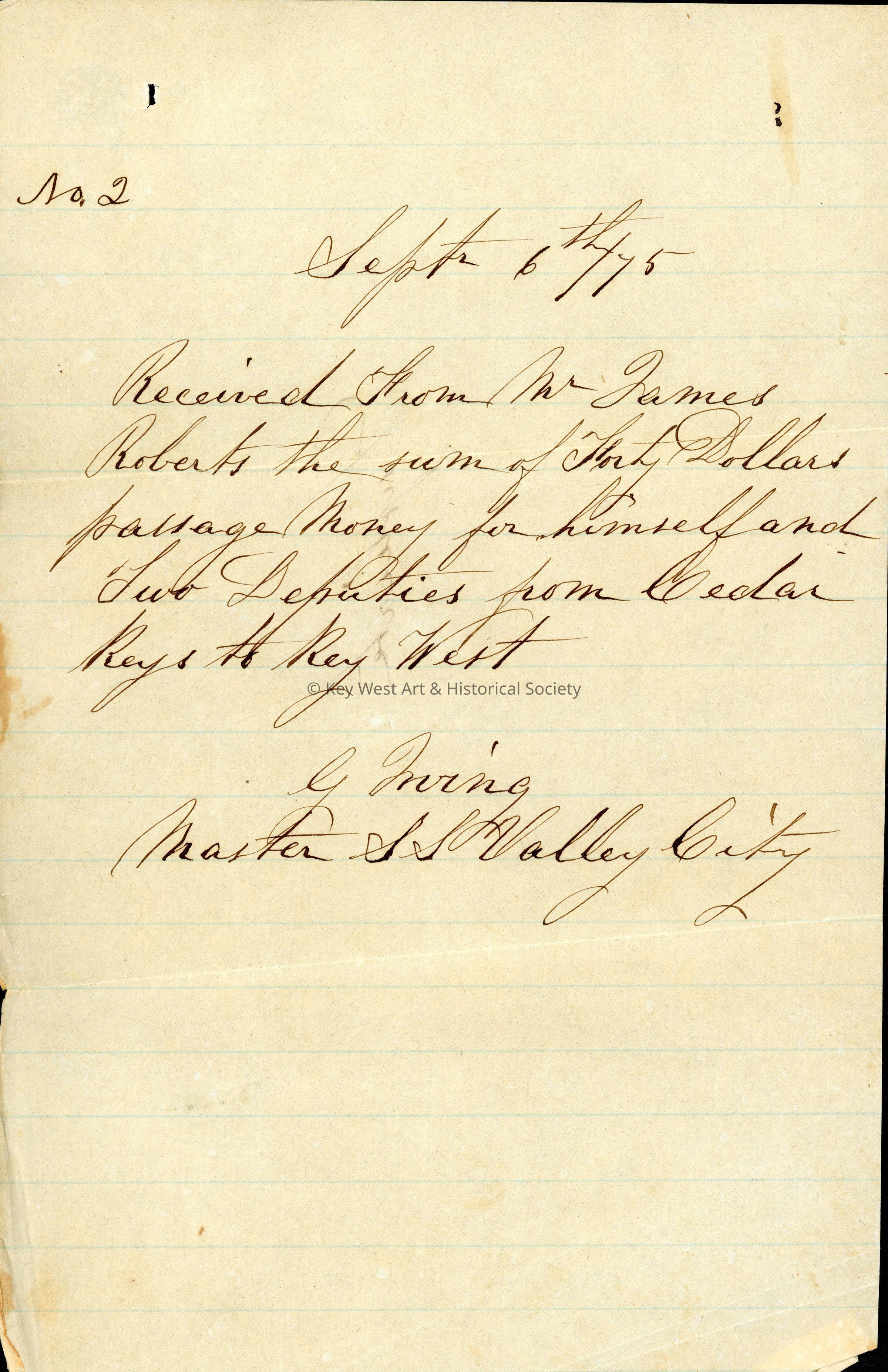 Note signifying the payment of forty dollars ($40) from Mr. James Roberts to G. Irving, the Master of the SS VALLEY CITY. The fee was for the transportation of Roberts and two (2) deputies from Cedar Keys to Key West. The back of the receipt reads 'Duplicate.'Collection