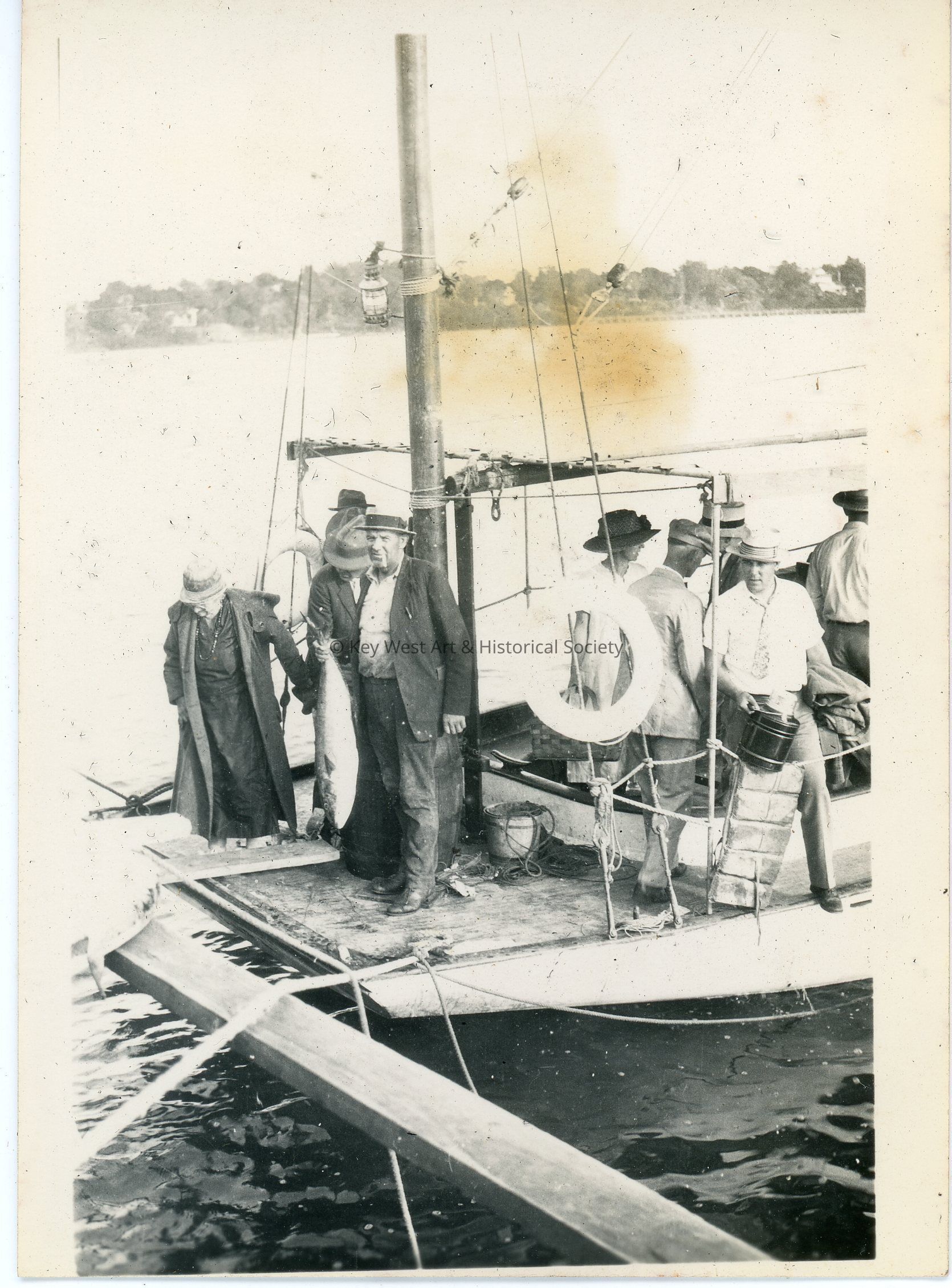 Black and white photograph of passengers and crew on a masted vessel. The photo was part of a photograph album began by Victor H. Baker in 1940.
