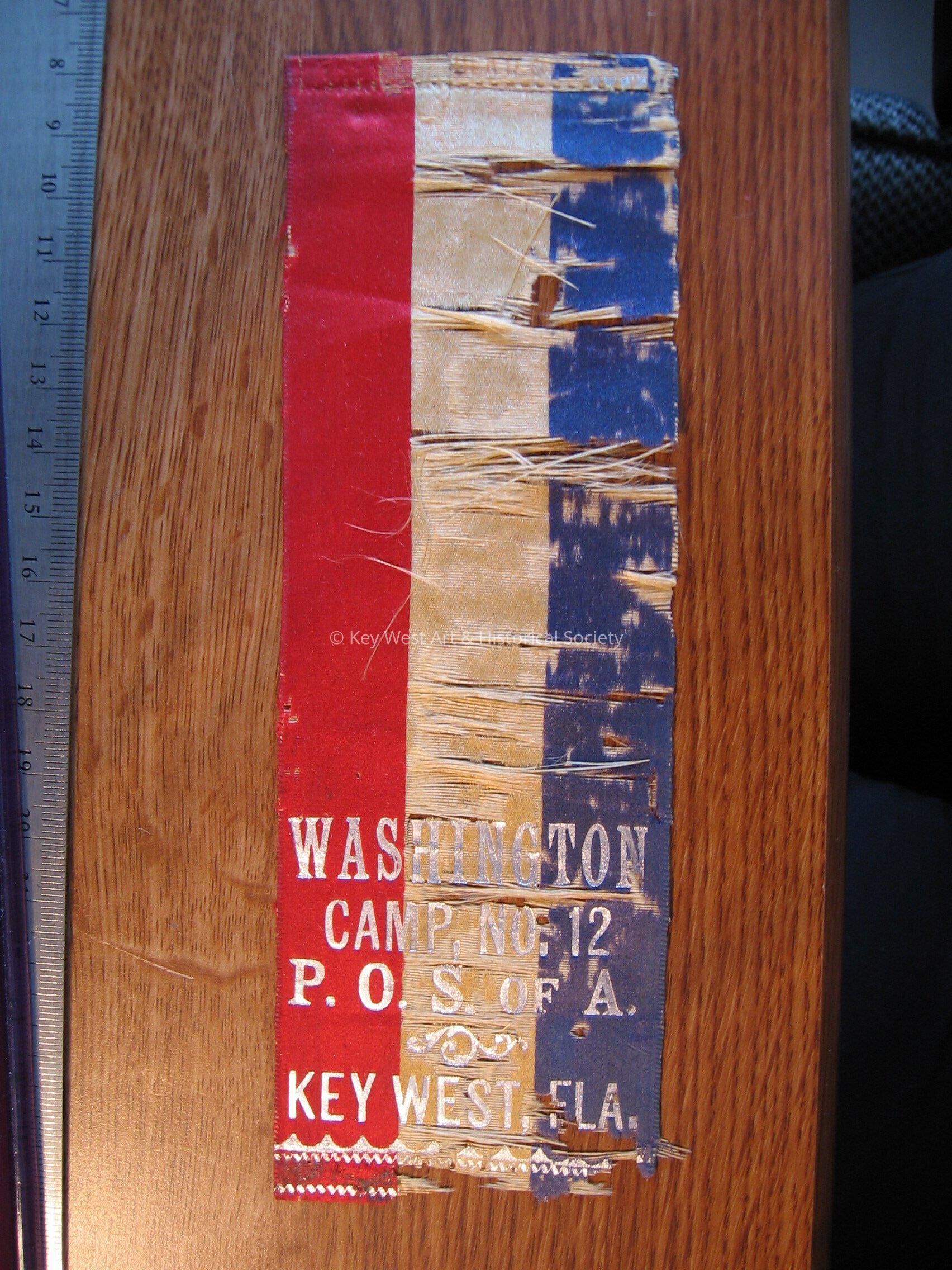 Red, white, and blue silk grosgrain ribbon that reads "Washington Camp No. 12 P.O.S. of A. Key West, FLA." The National Patriotic Order Sons of America was formed in 1847 to preserve American ideals and loyalty to the country.