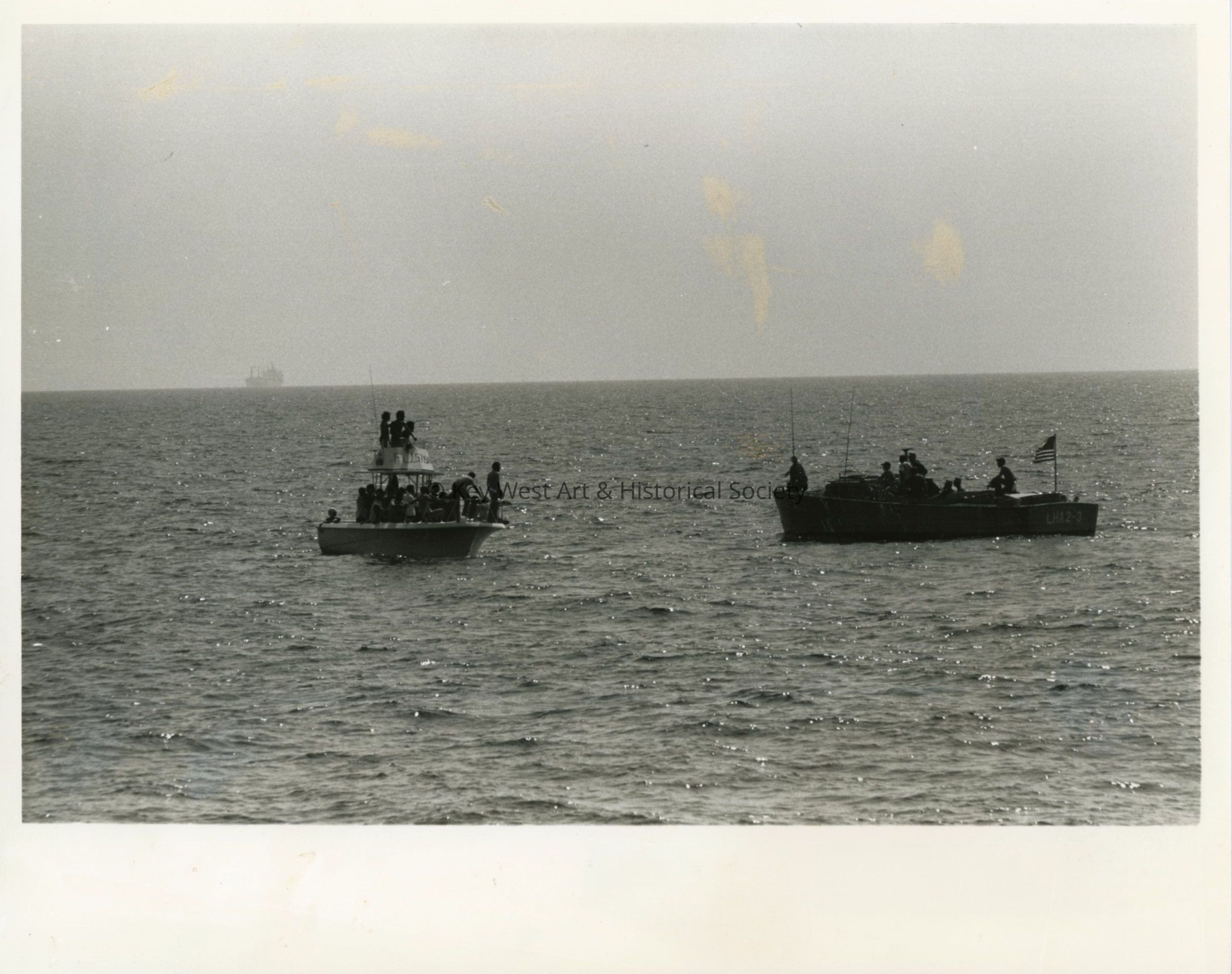 Black and white photograph of a U.S. military vessel rescuing 32 Cuban refugees from a small watercraft that had run out of gas in the Straights of Florida.