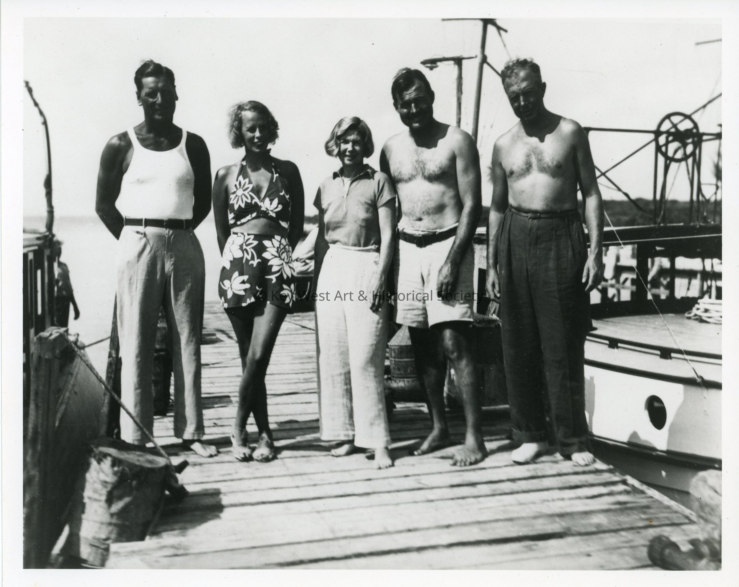 Black and white photograph of five people standing on a Bahamas dock (from l-r) unknown man, Eva Dickson von Blixen, Pauline Pfeiffer, Ernest Hemingway and Baron Bror von Blixen.Photograph Details