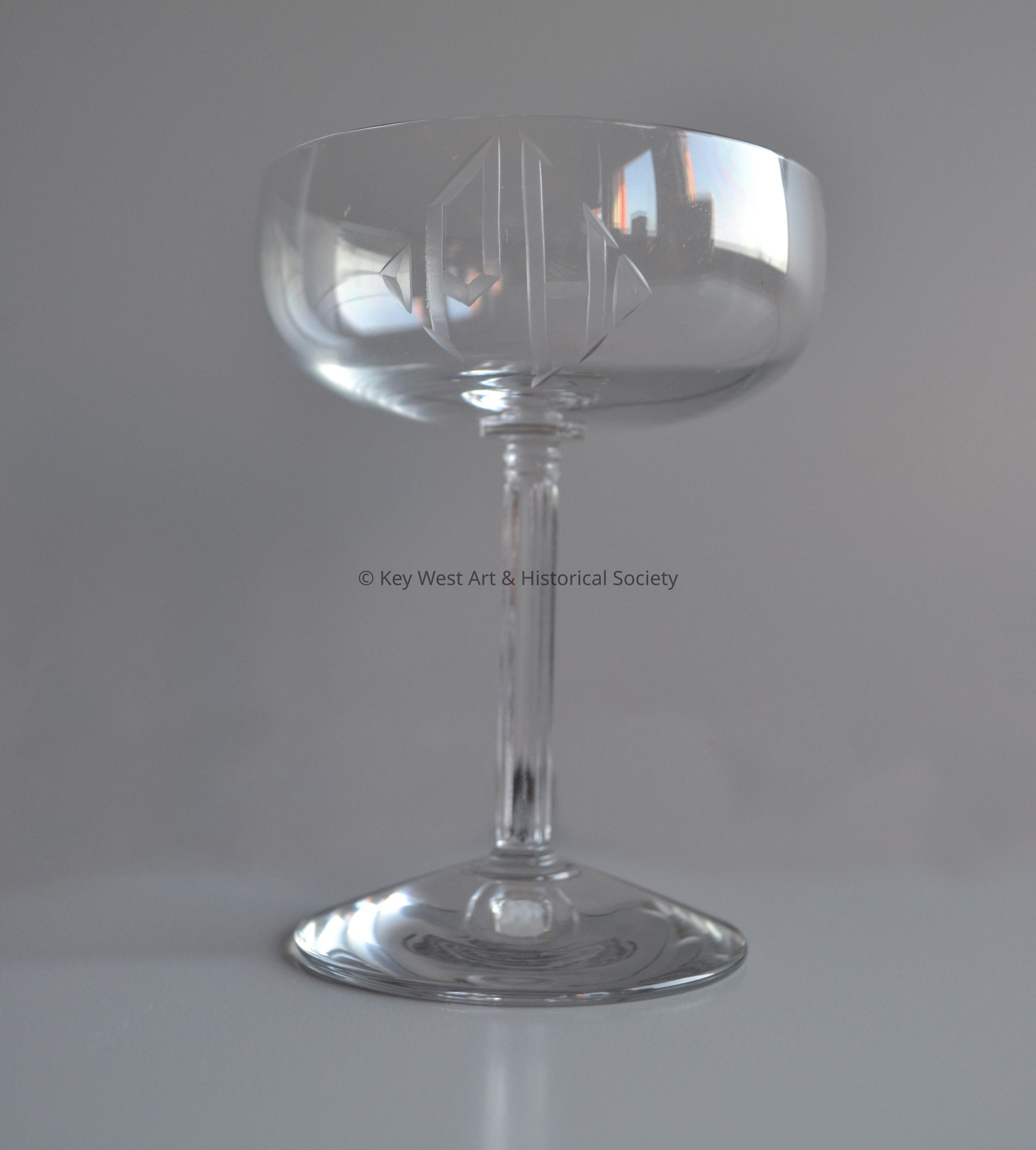 Glass champagne glass once belonging to Pauline Pfeiffer Hemingway when she lived in Key West. Engraved with the initials 'PH'.