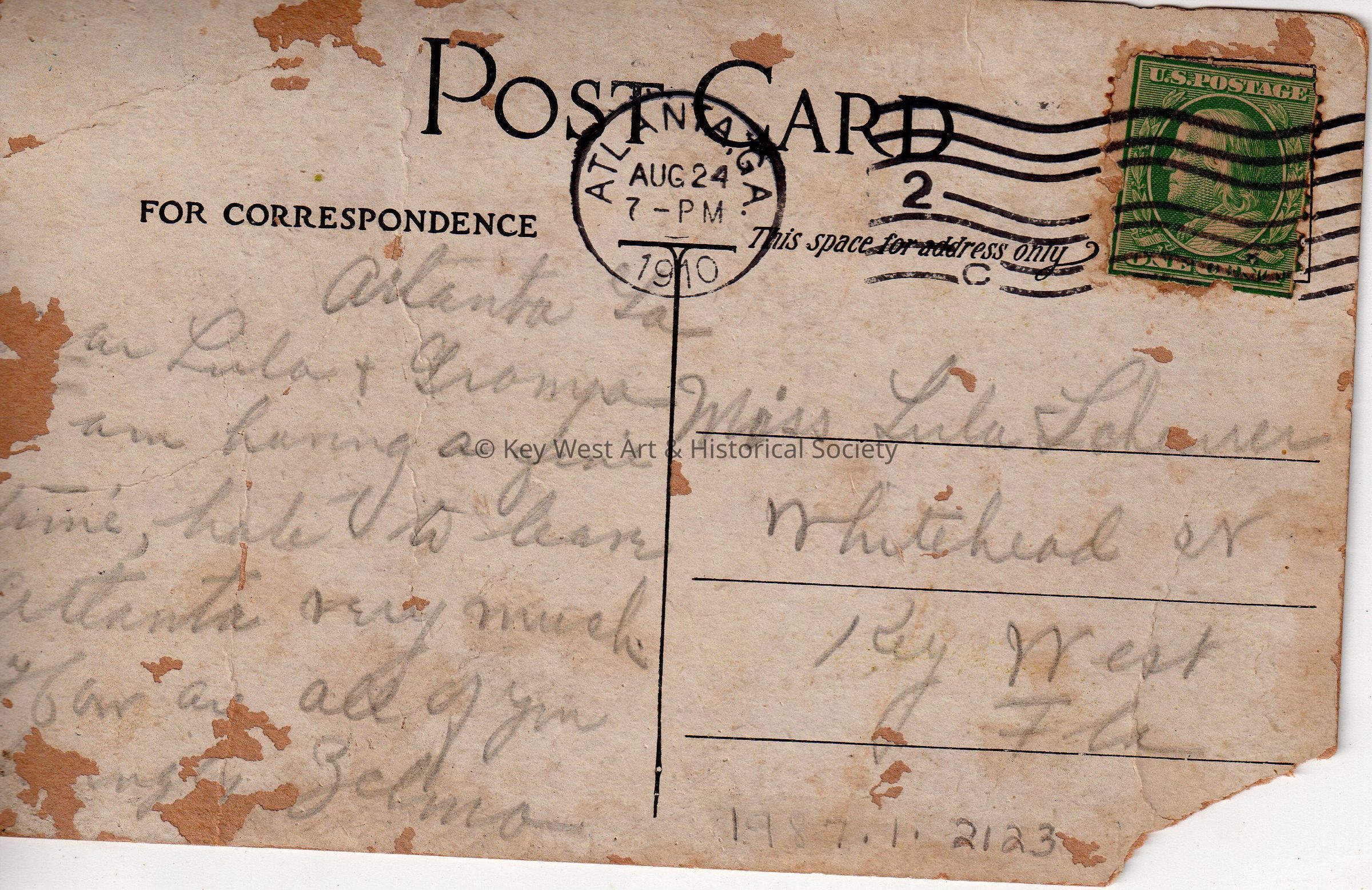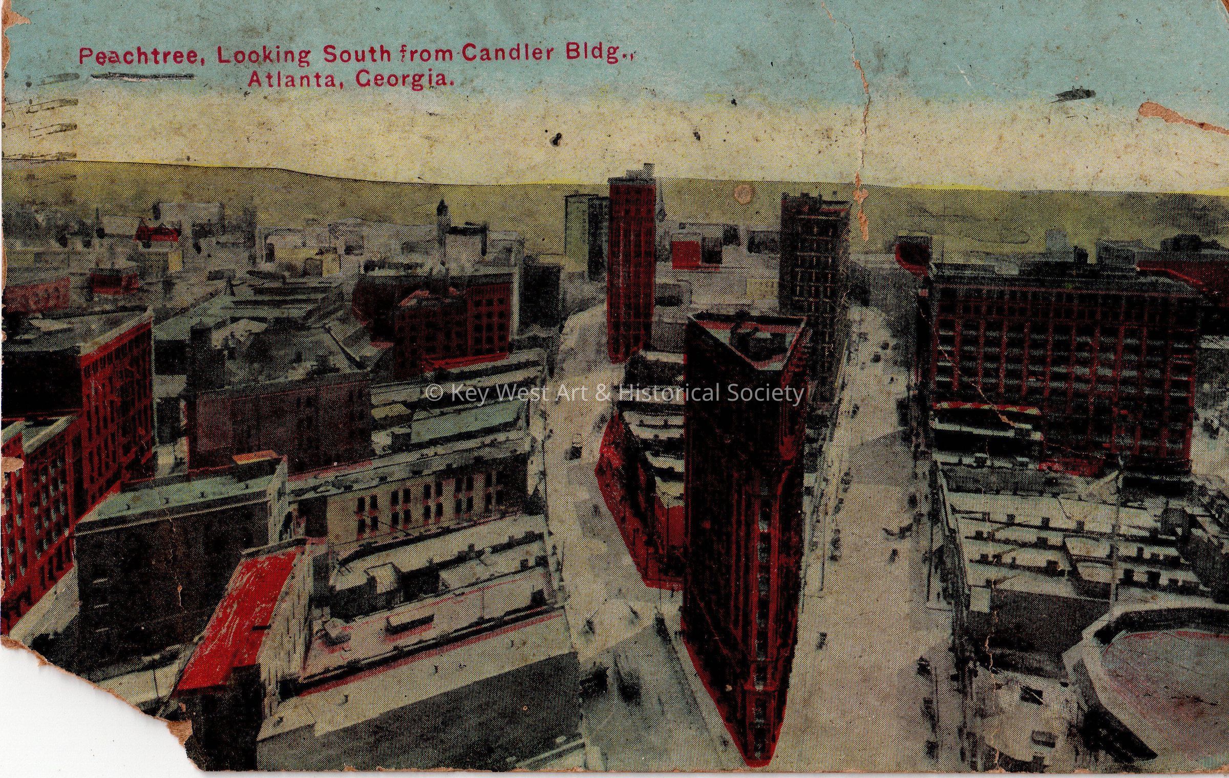 Postcard depicting a rooftop view of a city. The caption reads, ‘Peachtree, Looking South from Candler Building, Atlanta, Georgia.’ The message on the verso reads, ‘Atlanta, Georgia, Dear Lula & Grampa, I am having a fine time, hate to leave Atlanta very much. How are all of you? Lovingly, Zelma.’ The card is addressed to Miss Lula Scheurer, Whitehead Street, Key West, Florida, and is postmarked Atlanta, August 24, 1910.Subject Place