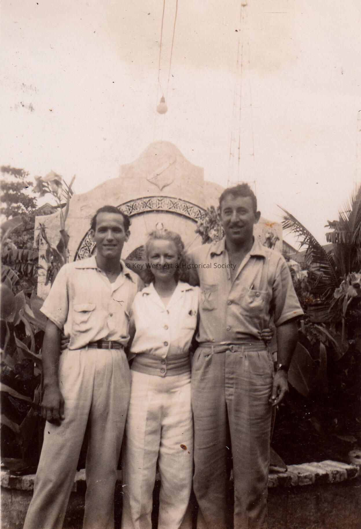 Two unknown military men and a woman outside at Pena's Garden of Roses Night Club, Key West.Collection